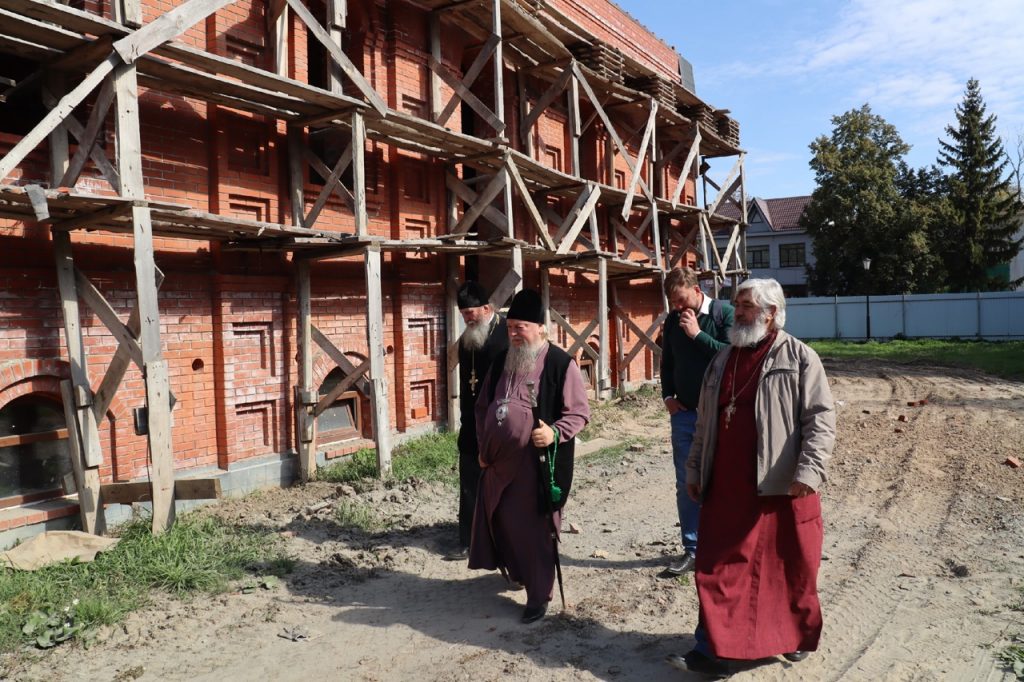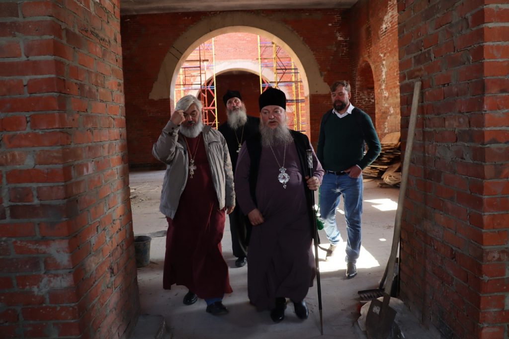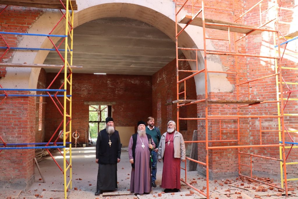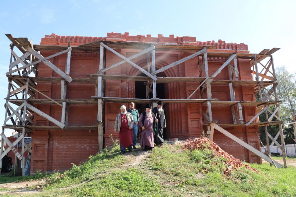 Его Преосвященство в сопровождении благочинного Белинского округа протоиерея Георгия Трофимова; настоятеля молитвенного дома  Святого Праведного Филарета Милостивого с.Невежкино Белинского района иерея Георгия Благодарева осмотрел выполненные работы на данном этапе строительства храма и обсудил наиболее важные вопросы  дальнейшего ведения строительных и отделочных работ.