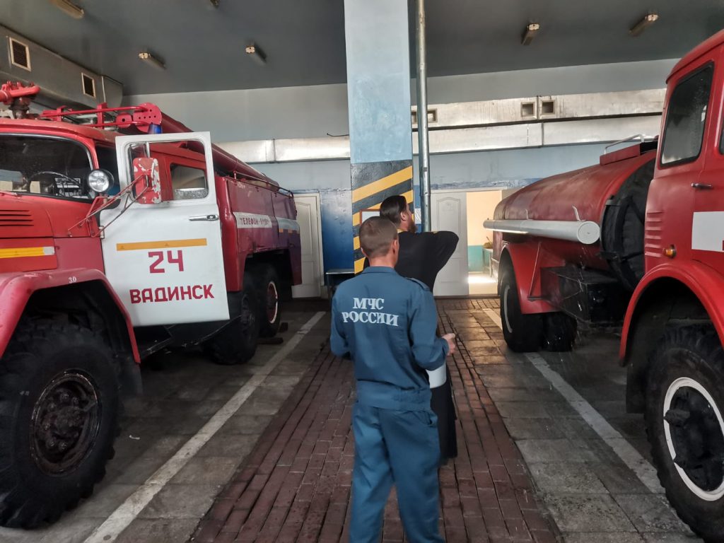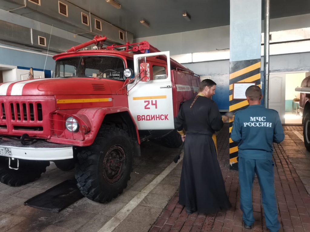В этот день настоятель церкви Богоявления Господня с.Вадинска иерей Сергий Третьяков посетил 24-ю пожарно-спасательную часть 3-го пожарно-спасательного отряда ФПС ГПС ГУ МЧС России по Пензенской области, где совершил молебен с водоосвящением. После молебна священник окропил технику и сказал напутственные слова спасателям.