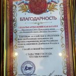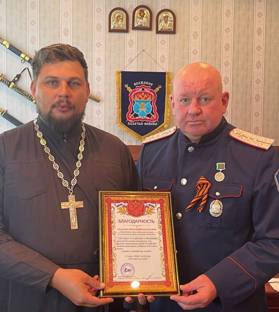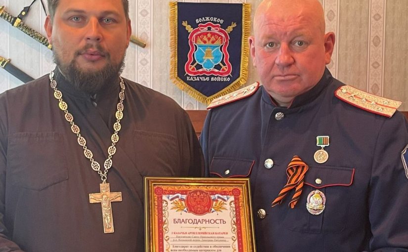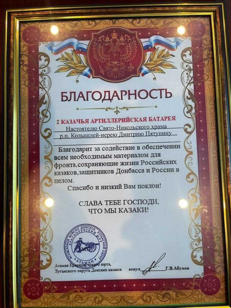 В документе от братьев-казаков отмечено: «2 Казачья артиллерийская батарея благодарит настоятеля Свято-Никольского храма р.п. Колышлей иерея Димитрия Пятунина за содействие в обеспечении всем необходимым материалом для фронта, сохраняющие жизни Российских казаков, защитников Донбасса и России в целом. Спаси Вас Господи и низкий поклон! Слава Тебе Господи, что мы казаки!».