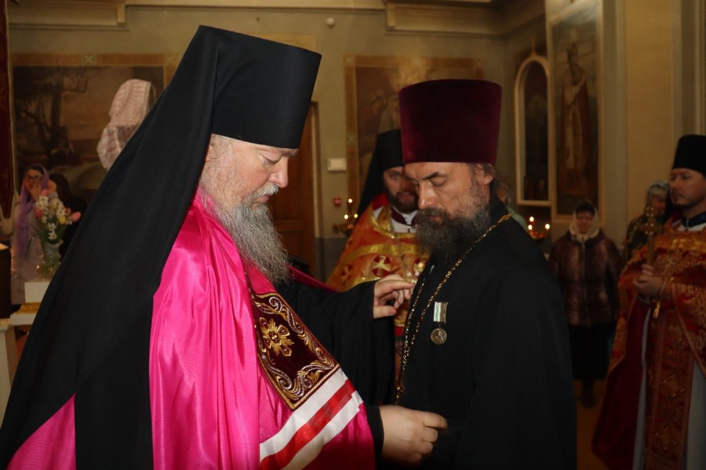 По окончании Литургии Преосвященнейший Владыка Митрофан в благодарность за усердные труды на благо Святой Церкви наградил Епархиальной медалью Сердобской епархии Святого Преподобномученика Пахомия Скановского III степени — иерея Андрея Самонина.