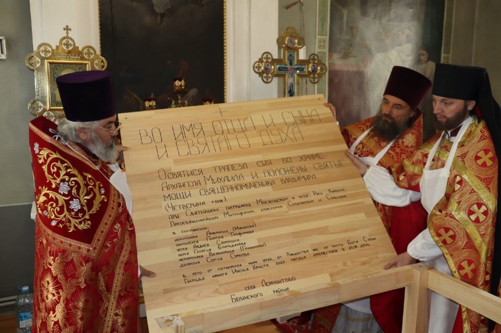08 мая 2025 года, в день памяти святого апостола и евангелиста Марка, епископ Сердобский и Спасский Митрофан совершил великое освящение храма Архангела Михаила с. Лермонтово Белинского района по «чину освящения храма от архиерея творимаго» и возглавил Божественную литургию в новоосвященном храме.