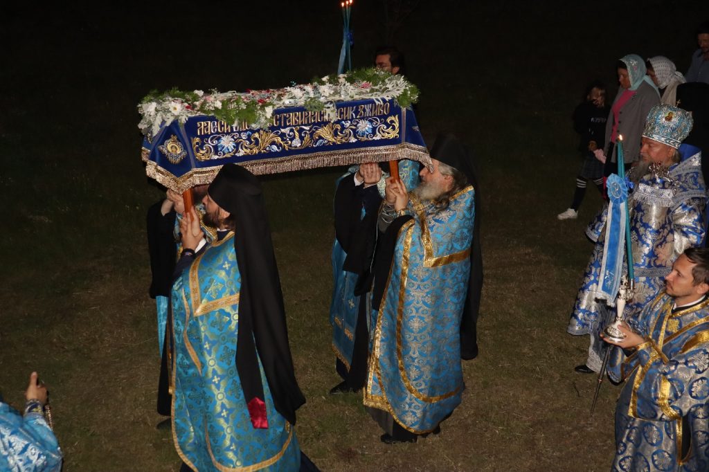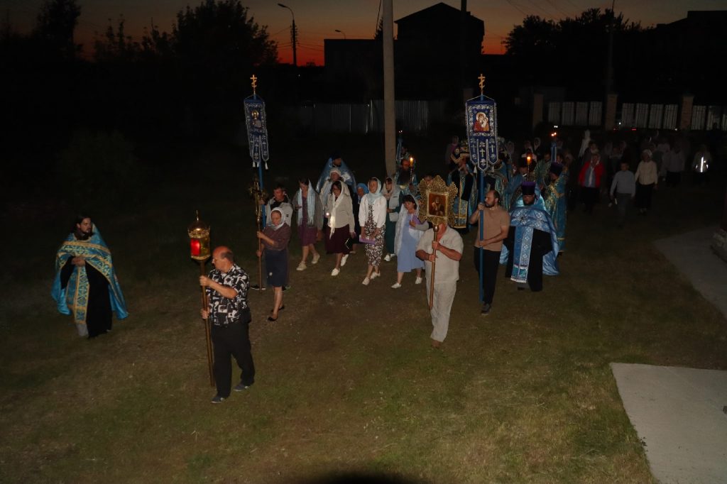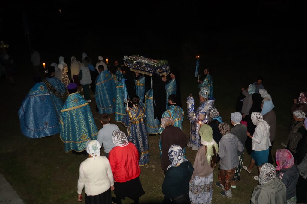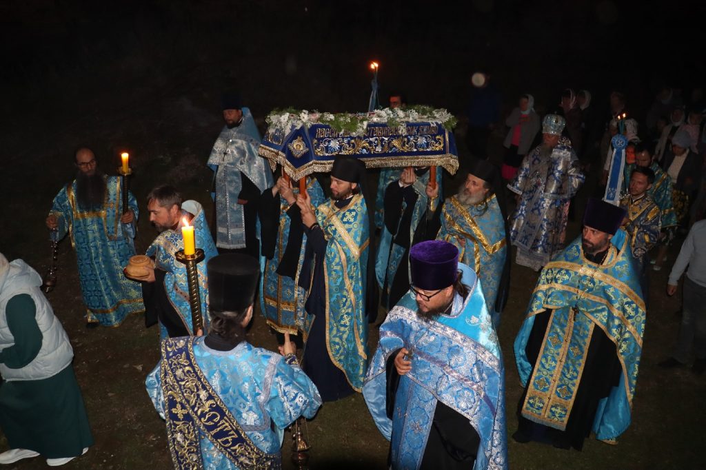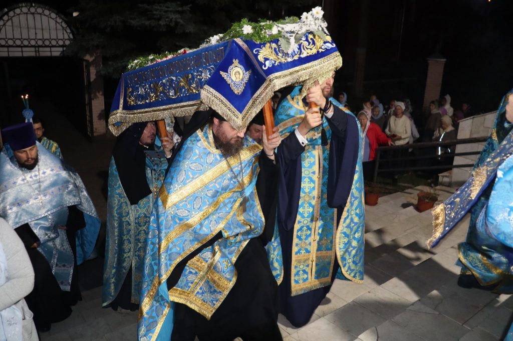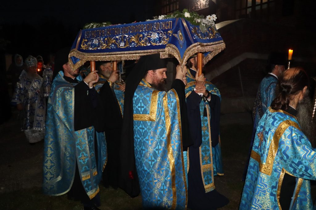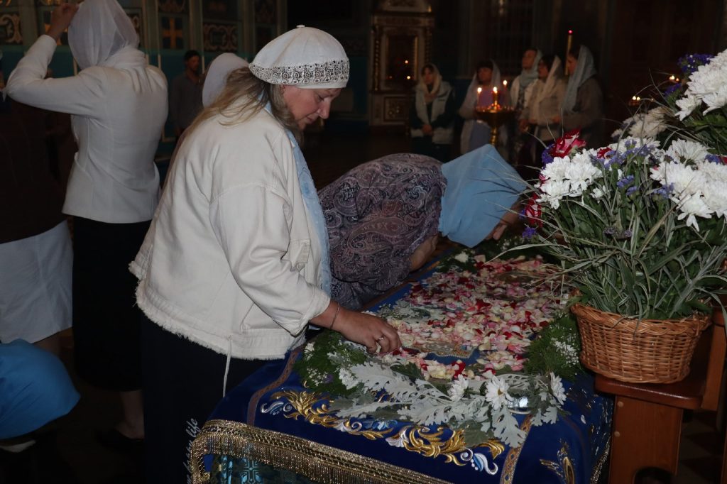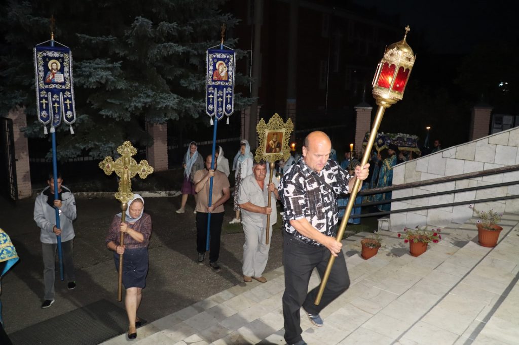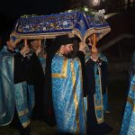 После великого славословия епископ Митрофан возглавил крестный ход вокруг храма с плащаницей с изображением Успения Пресвятой Богородицы. Во время помазания елеем все молящиеся совершили перед плащаницей молитвенное поклонение.