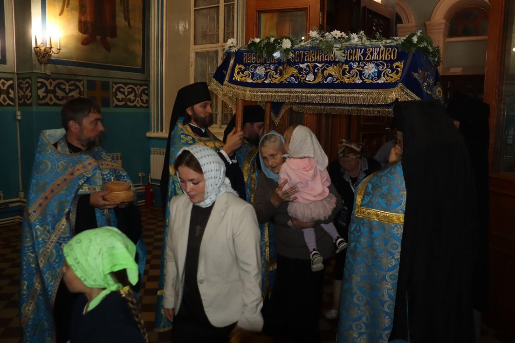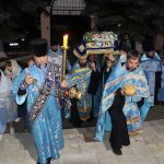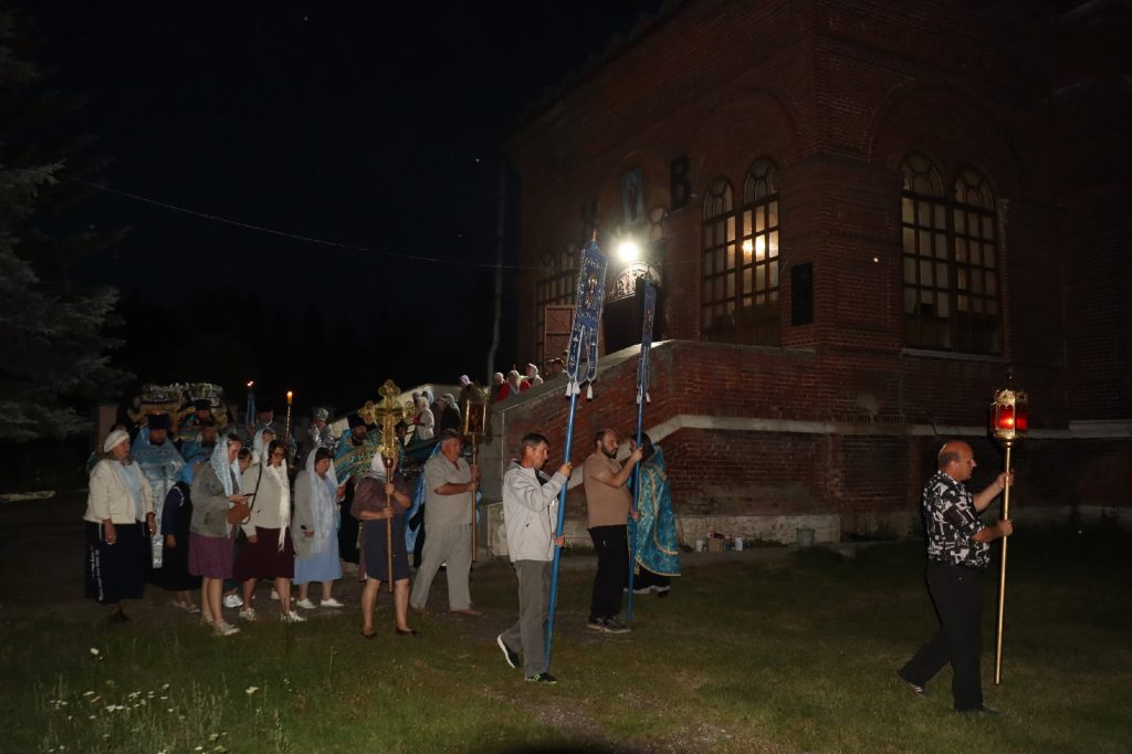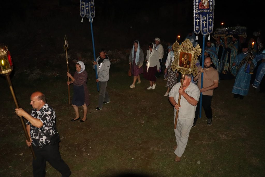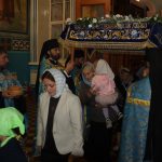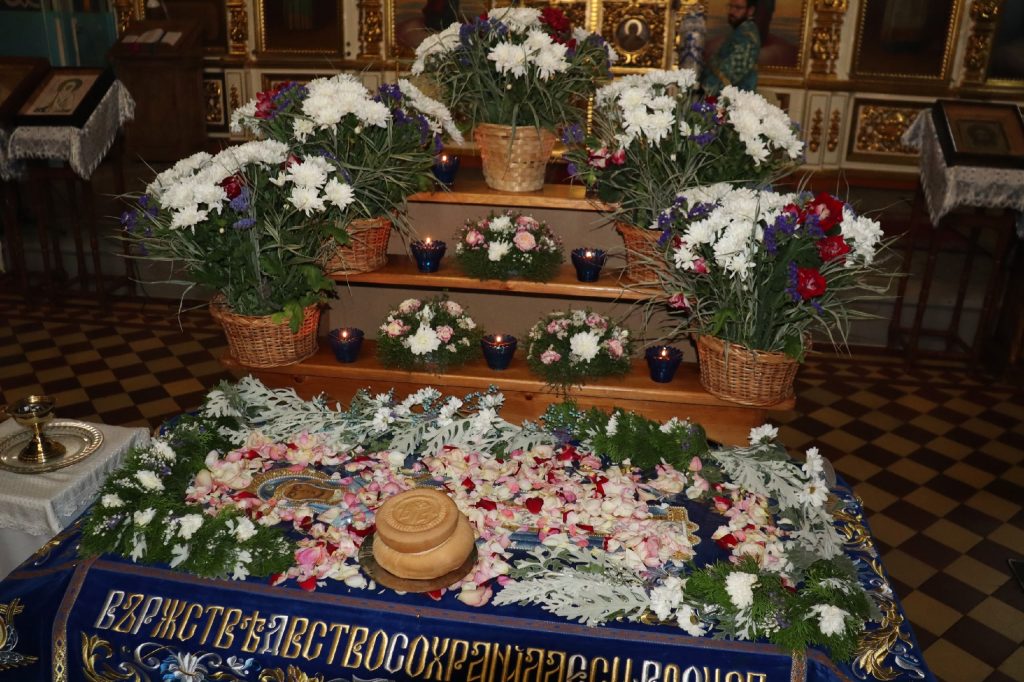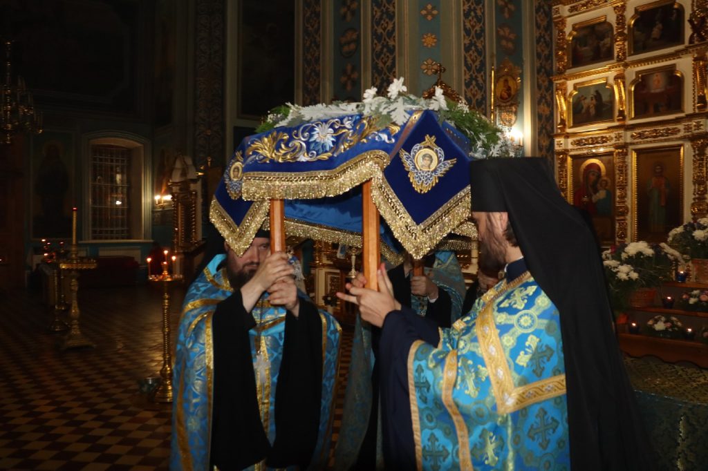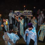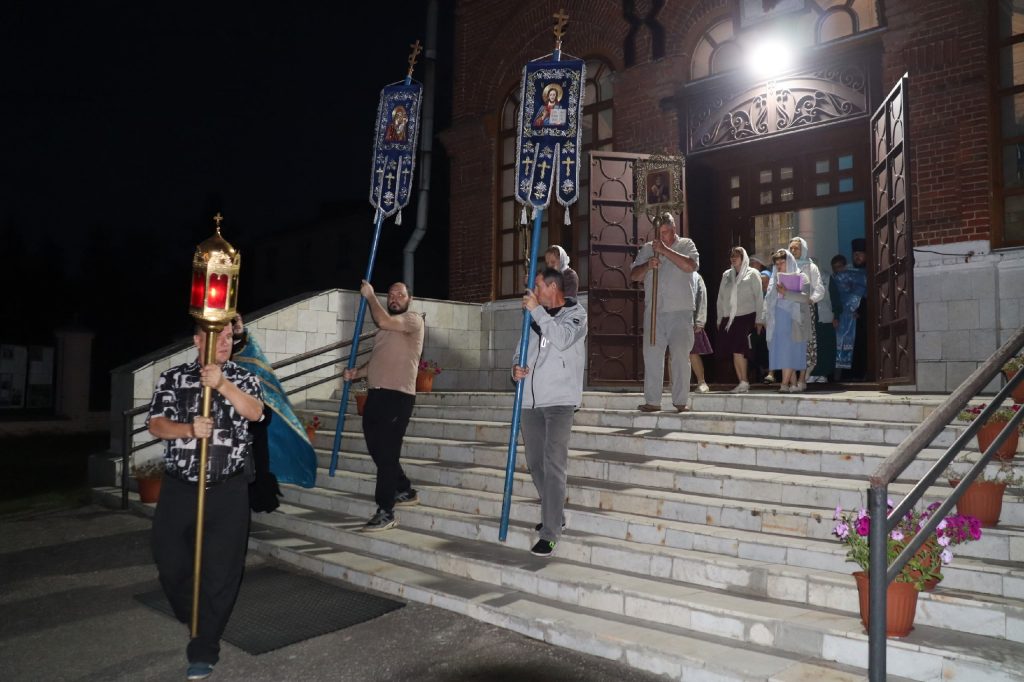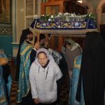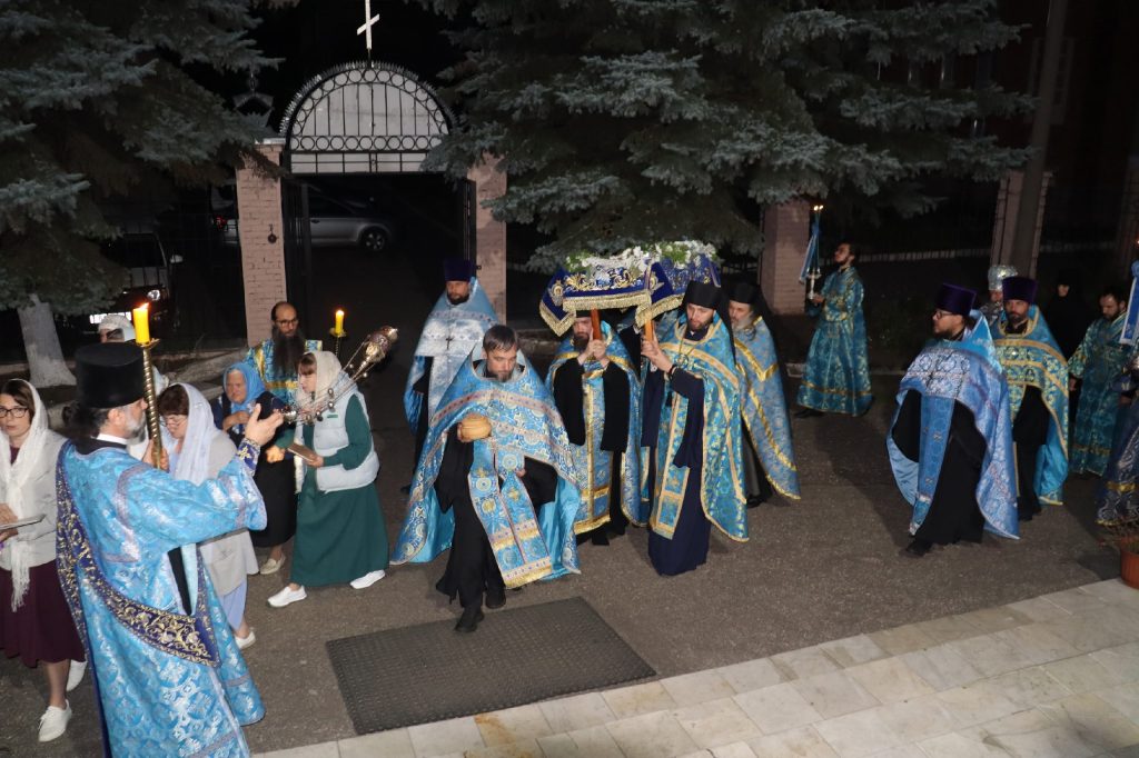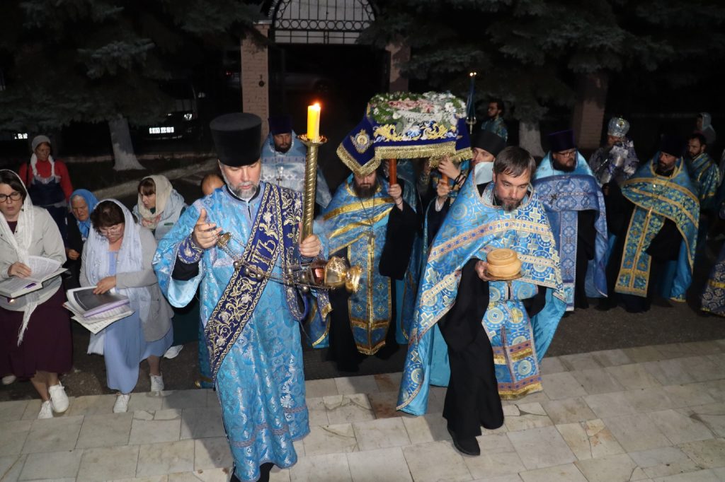 После великого славословия епископ Митрофан возглавил крестный ход вокруг храма с плащаницей с изображением Успения Пресвятой Богородицы. Во время помазания елеем все молящиеся совершили перед плащаницей молитвенное поклонение.