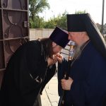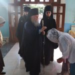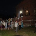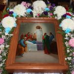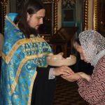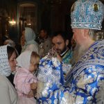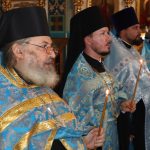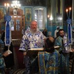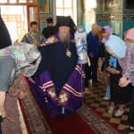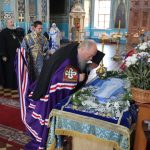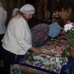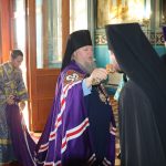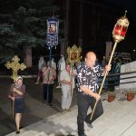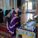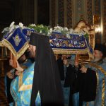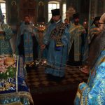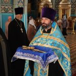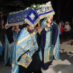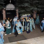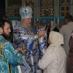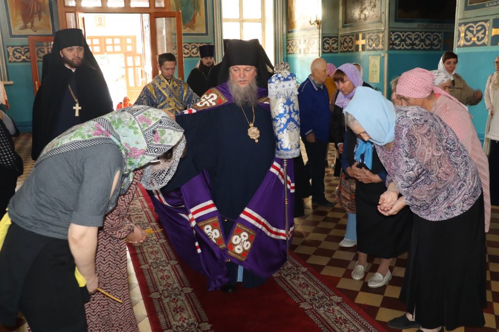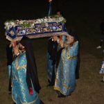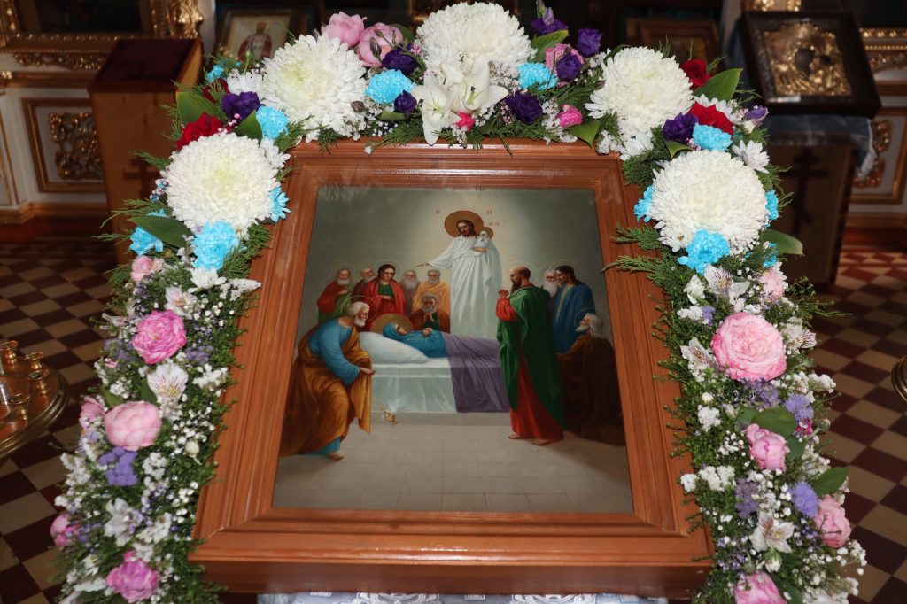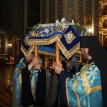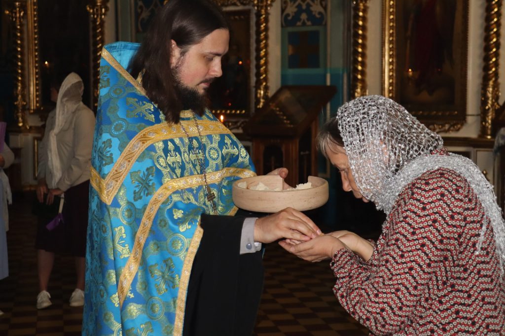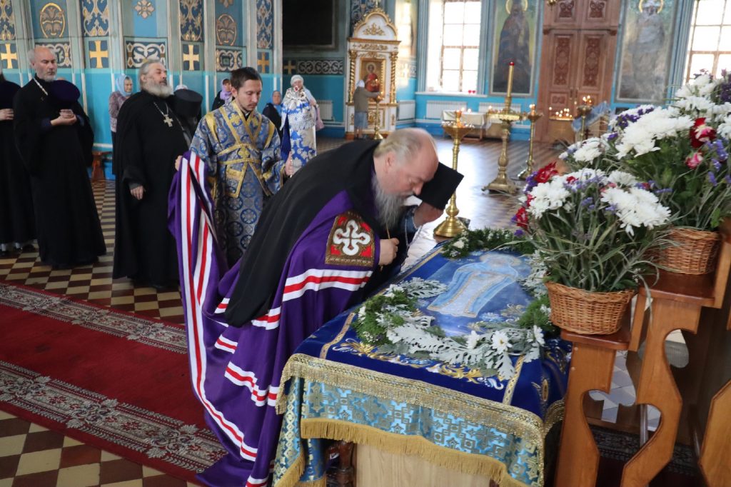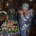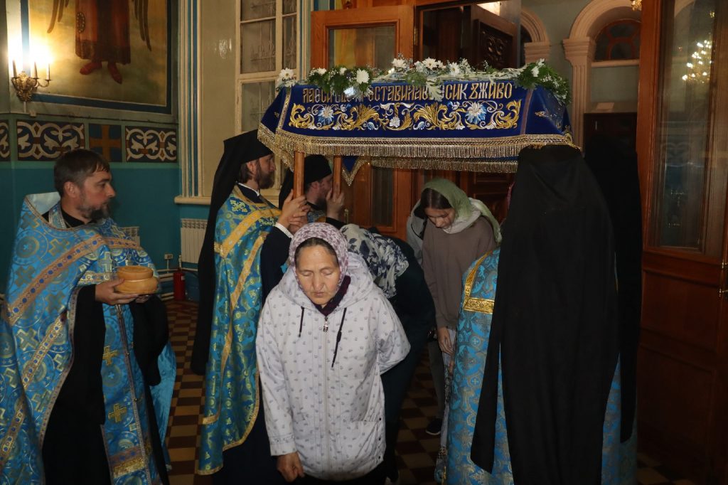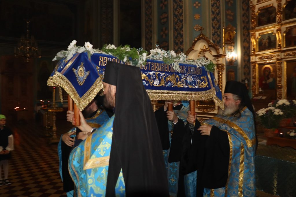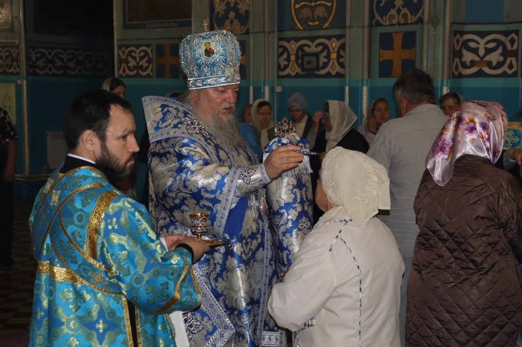 После великого славословия епископ Митрофан возглавил крестный ход вокруг храма с плащаницей с изображением Успения Пресвятой Богородицы. Во время помазания елеем все молящиеся совершили перед плащаницей молитвенное поклонение.