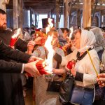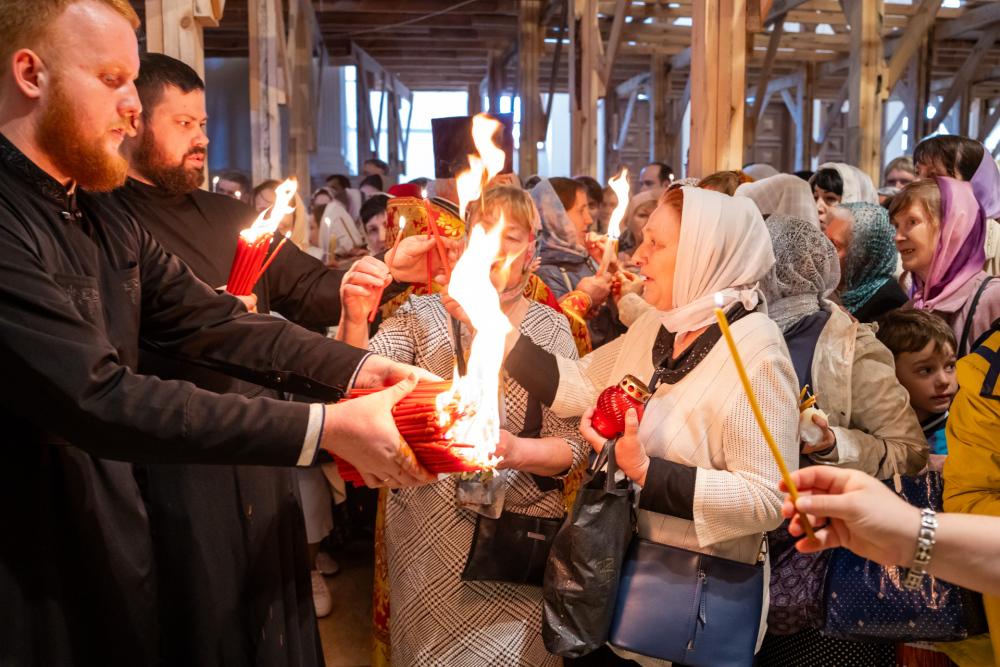 Перед праздничной Пасхальной службой был доставлен Благодатный огонь, от которого присутствующие в храме смогли зажечь свои свечи. С понедельника Светлой седмицы все желающие смогут получить Благодатный огонь в храмах епархии.