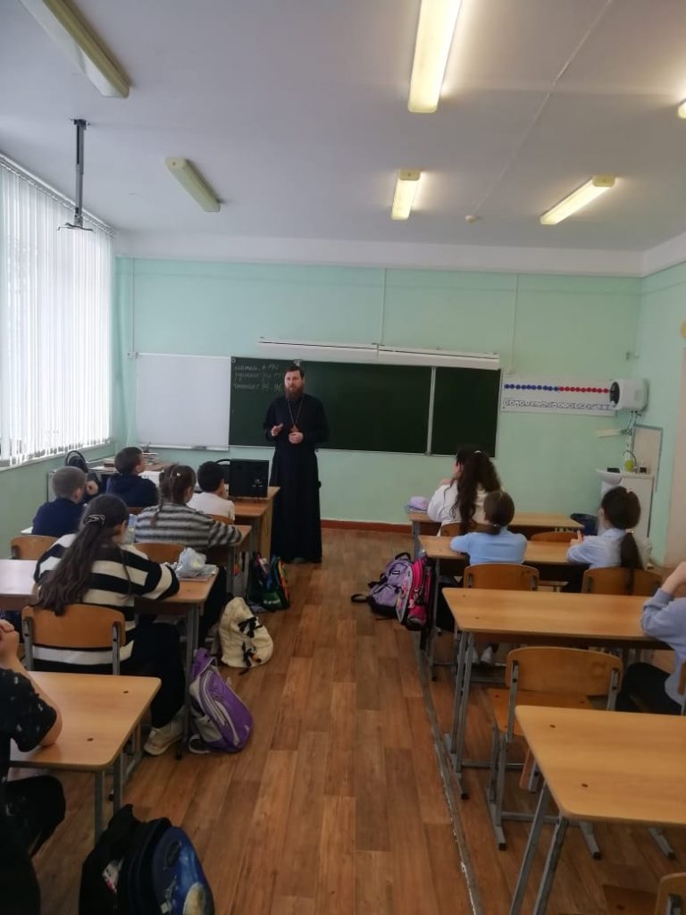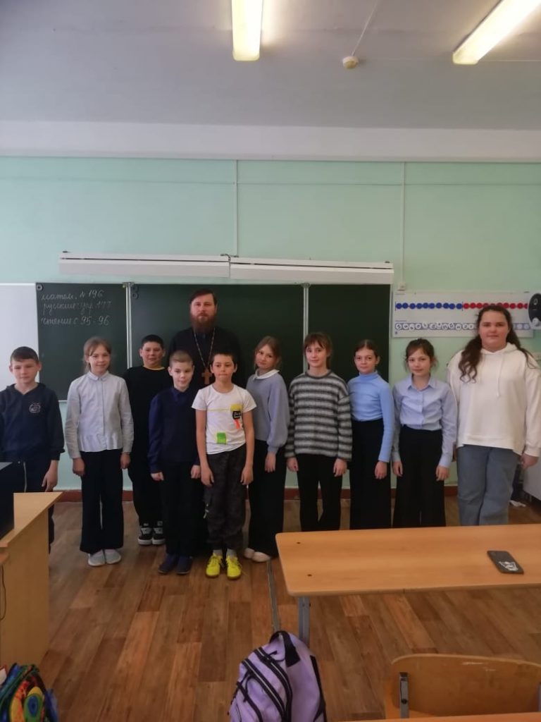 8 апреля 2025 года благочинный Вадинского округа, настоятель церкви Михаила Архангела с.Вадинска иерей Сергий Третьяков встретился с обучающимися 4б класса МОУ СОШ с.Вадинска.