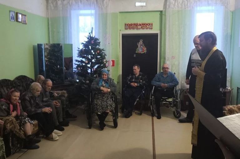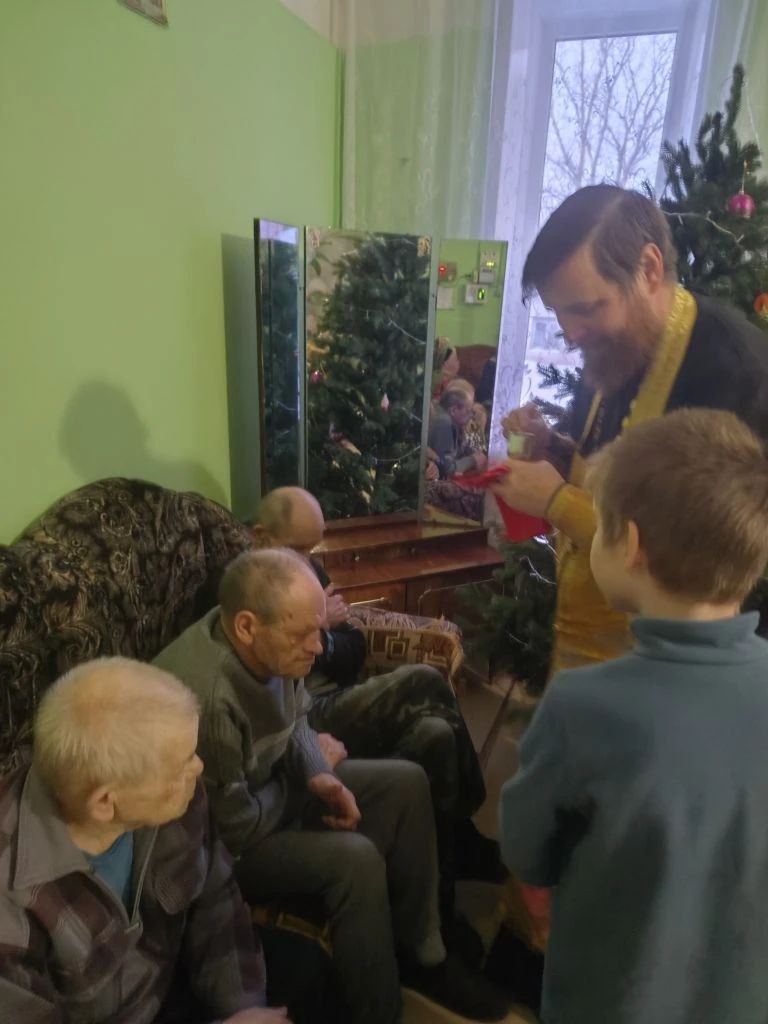 Священник совершил для желающих Таинство Покаяния и Причащения, а также поздравил проживающих и сотрудников стационарного отделения с Рождеством Христовым и от прихода подарил сладкие подарки каждому постояльцу.