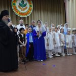 Преосвященнейший Владыка Митрофан вручил сладкие подарки всем юным участникам, а они в свою очередь поделились своими подарками со зрителями.