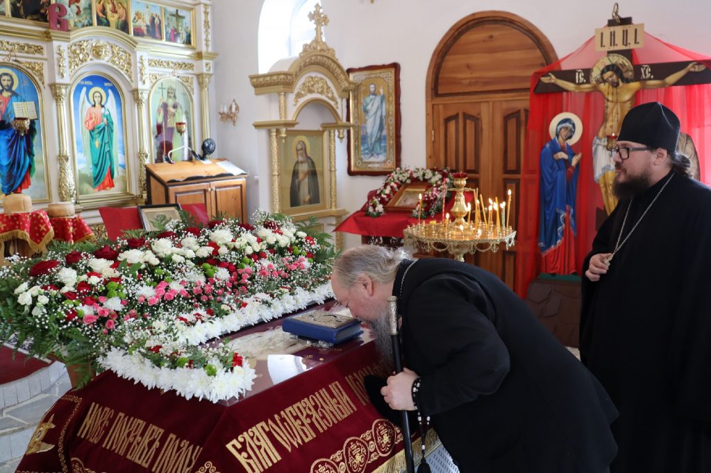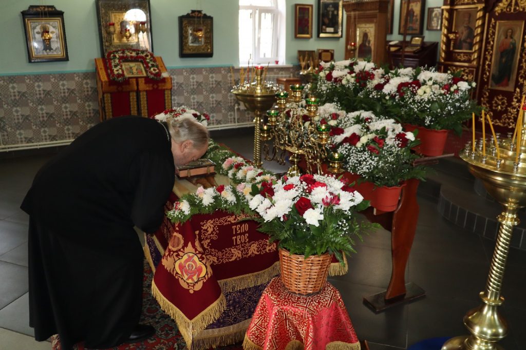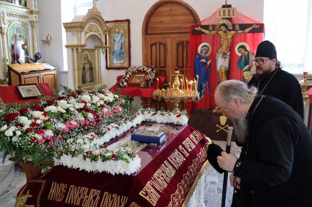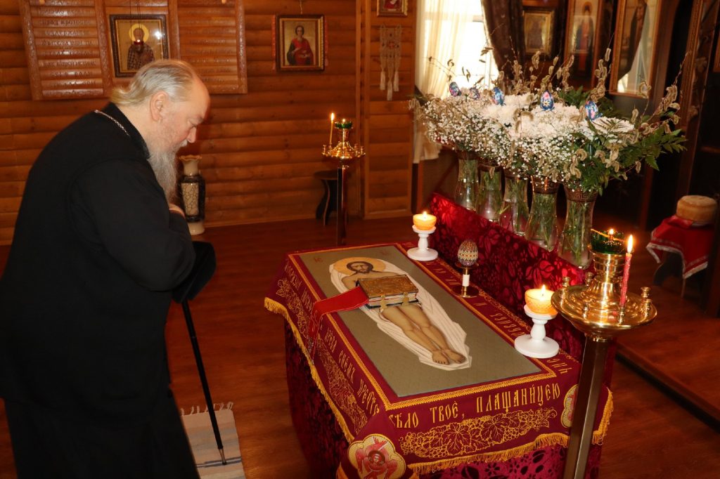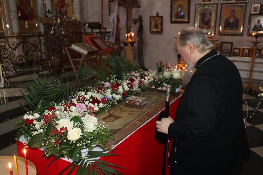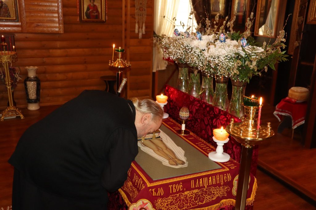 В каждом храме Владыка Митрофан поздравил духовенство и прихожан с наступающим праздником Воскресения Христова и приложился к Плащанице Христа Спасителя.