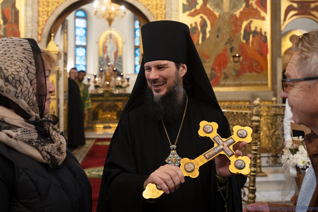 На отпусте при целовании креста каждый участник богослужения поздравил епископа Нестора с именинами.