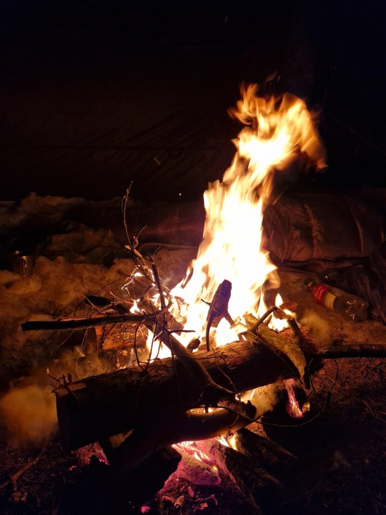 В этом году было тепло, температура в ночные часы составила примерно -18-20°С. Сидя у костра, всех согревали чай и душевные разговоры.