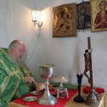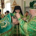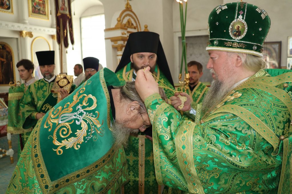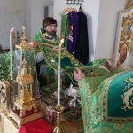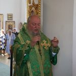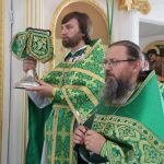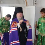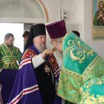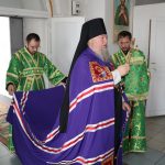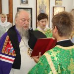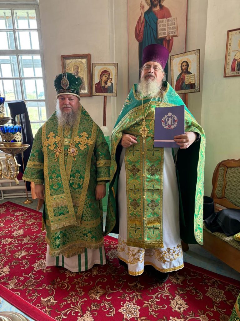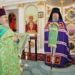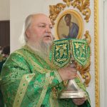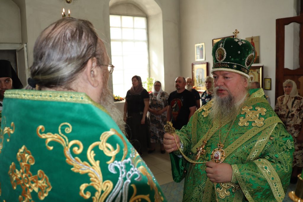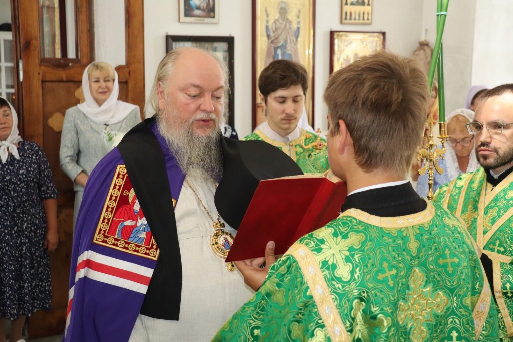 На малом входе Преосвященнейший Владыка Митрофан возложил на протоиерея Александра Белова наперсный крест с украшениями и вручил свидетельство, о том, что по представлению правящего архиерея в благодарность за усердные труды на благо Церкви настоятель храма протоиерей Александр Белов Указом Святейшего Патриарха Московского и всея Руси КИРИЛЛА удостоен очередной богослужебно-иерархической награды – права ношения Креста с украшениями.