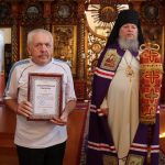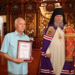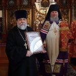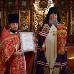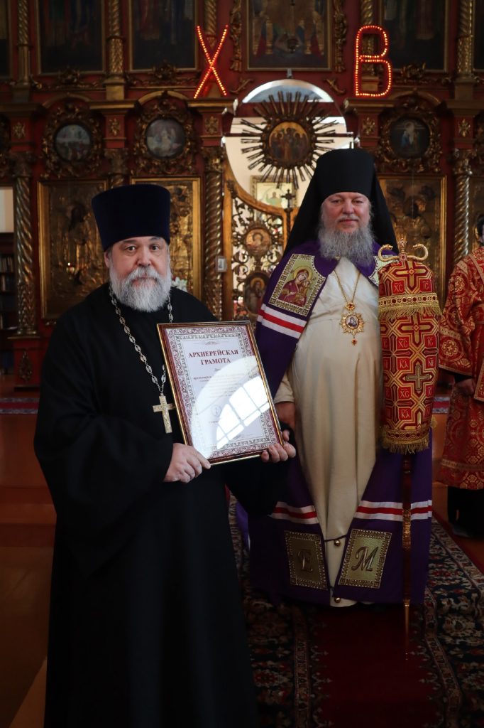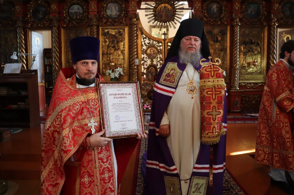 Затем состоялось вручение церковных наград. Во внимание к усердным трудам во славу Святой Церкви Преосвященнейший Владыка Митрофан вручил Архиерейские грамоты клирикам собора Вознесения Господня г.Спасска протоиерею Георгию Калашникову и иерею Георгию Кузнецову.