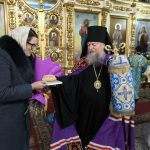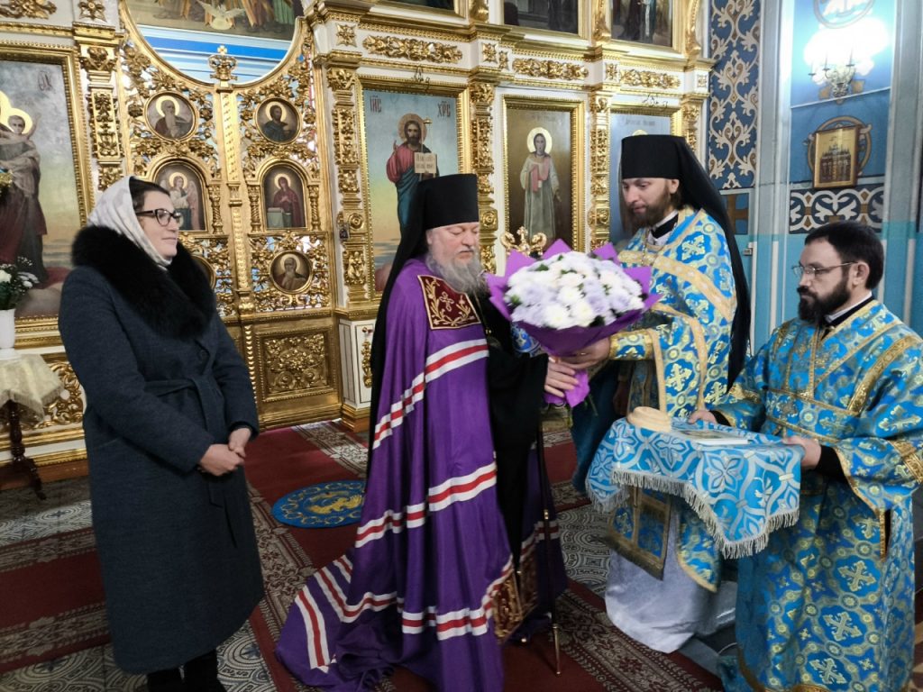 Затем Глава Сердобской епархии поздравил всех верующих, кто носит имя Екатерина, с Днем Ангела, а регенту хора Екатерине Гавриковой в знак благословения и духовной поддержки преподнес букет цветов и просфору.