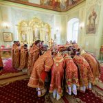 Архиереям сослужили секретарь Саратовского епархиального управления, благочинный Саратовского Центрального округа Саратовской епархии иерей Александр Чеботарёв; ректор Саратовской духовной семинарии, секретарь Епархиального совета Саратовской епархии, настоятель храма в честь иконы Божией Матери «Утоли моя печали» г. Саратова протоиерей Сергий Штурбабин; секретарь Архиерейского совета Саратовской митрополии, секретарь главы Саратовской митрополии по делам монастырей и монашествующих, благочинный монастырей Саратовской епархии, наместник, духовник Свято-Никольского мужского монастыря г. Саратова игумен Серафим (Баранов); благочинный Саратовского Северного округа, председатель финансово-хозяйственного управления Саратовской епархии, настоятель собора иерей Олег Грушин; благочинный Саратовского Западного округа, настоятель Николо-Тихвинского соборного храма г. Саратова протоиерей Димитрий Зверев; благочинный Саратовского Южного округа, настоятель храма святителя Тихона, епископа Воронежского, Задонского чудотворца, г. Саратова протоиерей Александр Домрачёв; клирик собора, директор Покровской православной классической гимназии имени святого благоверного князя Александра Невского г. Саратова иерей Ярослав Коздринь; секретарь Покровского епархиального управления, настоятель храма Покрова Божией Матери на Волге г. Покровска (Энгельса) иерей Аркадий Махсумов (Покровская епархия); благочинный Саратовского Северо-Западного округа, помощник епархиального архиерея по богослужебным вопросам, настоятель храма святого великомученика Георгия Победоносца г. Саратова иерей Алексий Булеков; секретарь главы Саратовской митрополии, благочинный Саратовского Восточного округа, руководитель епархиального отдела по взаимоотношениям Церкви с обществом и СМИ, настоятель Свято-Троицкого кафедрального собора г. Саратова иерей Александр Бородовицын; благочинный Саратовского Юго-Западного округа, заместитель председателя финансово-хозяйственного управления Саратовской епархии, настоятель храма Всех святых, в земле Русской просиявших, г.Саратова иерей Павел Тараканов; иерей Максим Ивчук (Балаковская епархия); заместитель секретаря Саратовского епархиального управления, заместитель благочинного Саратовского Центрального округа, ключарь соборного храма святителя Спиридона Тримифунтского г. Саратова иерей Владимир Петриченко; клирик Свято-Троицкого кафедрального собора г. Саратова протодиакон Александр Пушкарёв; клирик собора диакон Иоанн Пушкарёв; клирик Свято-Троицкого кафедрального собора г. Саратова диакон Иоанн Новиков; директор Архиерейского мужского хора Саратовской митрополии, клирик Свято-Духовского собора г. Саратова диакон Иоанн Горбач; диакон Тимофей Улямаев (Балаковская епархия); клирик собора , заместитель руководителя епархиального отдела по делам молодежи диакон Даниил Пронин.