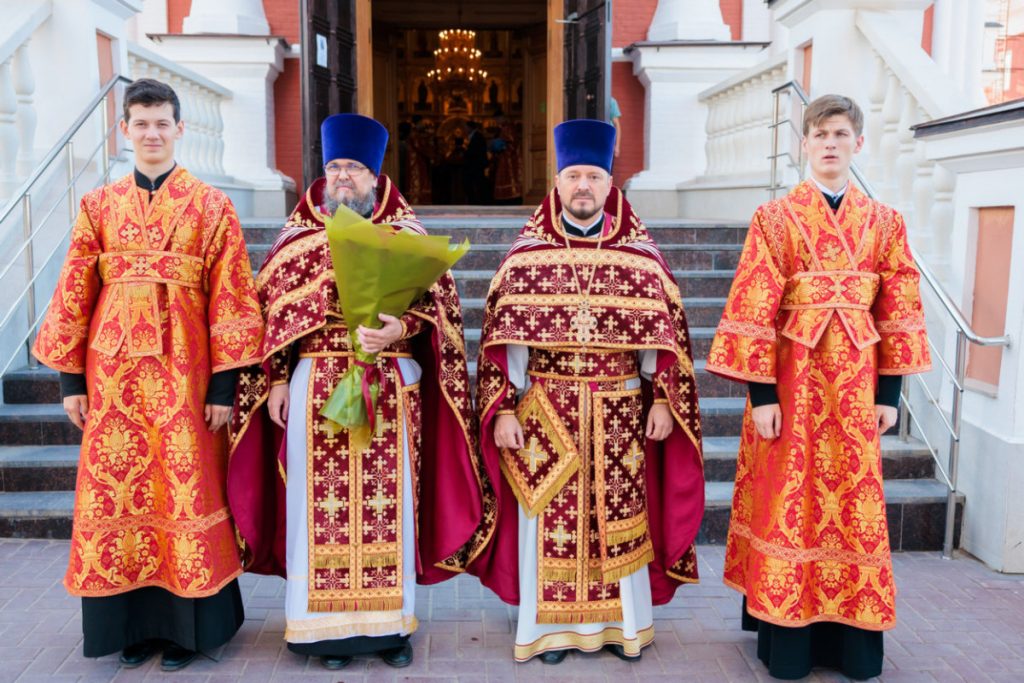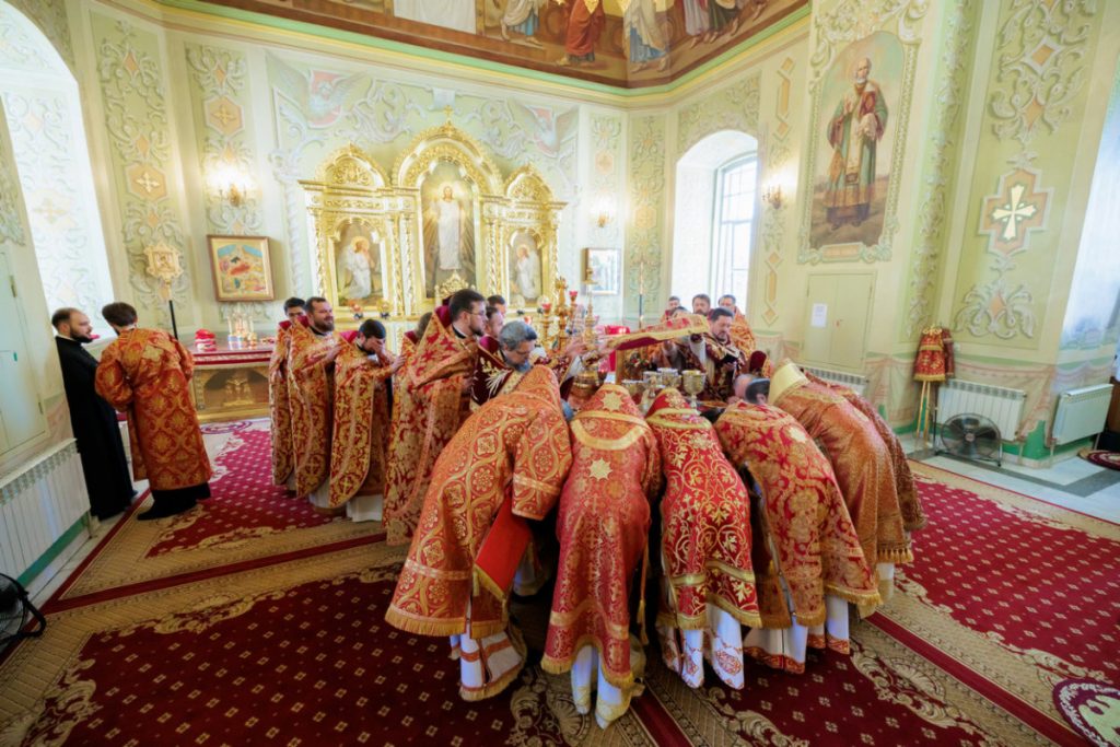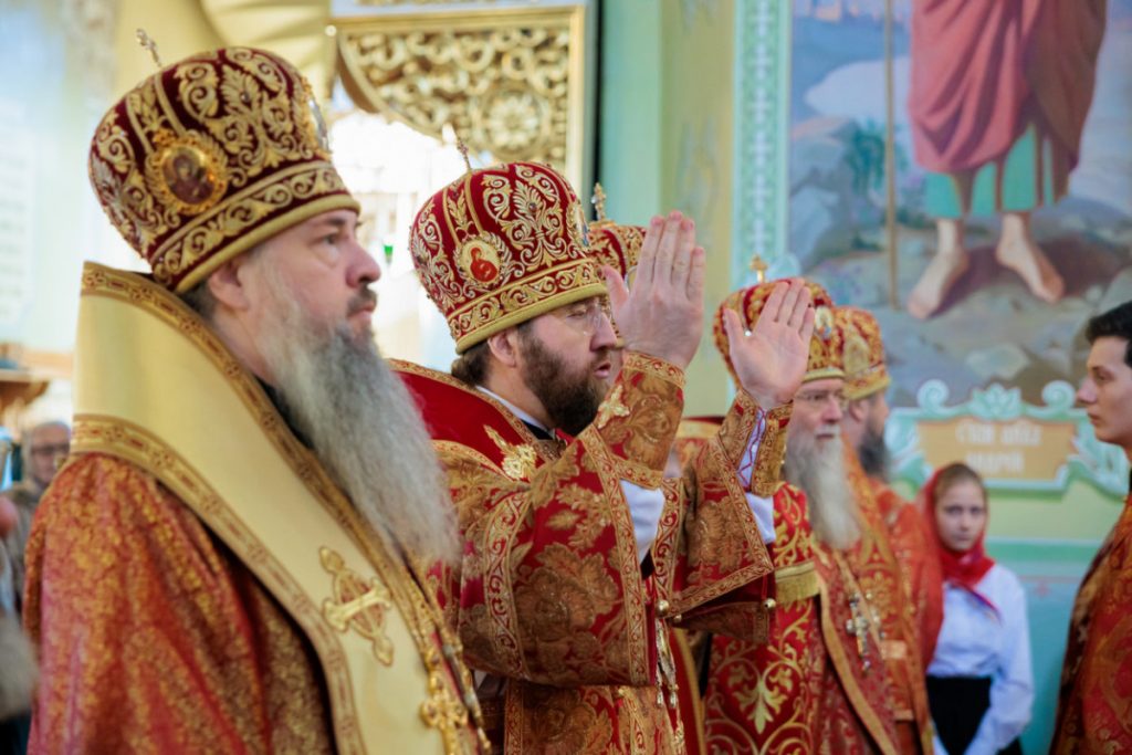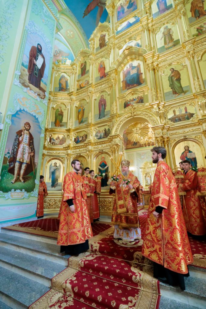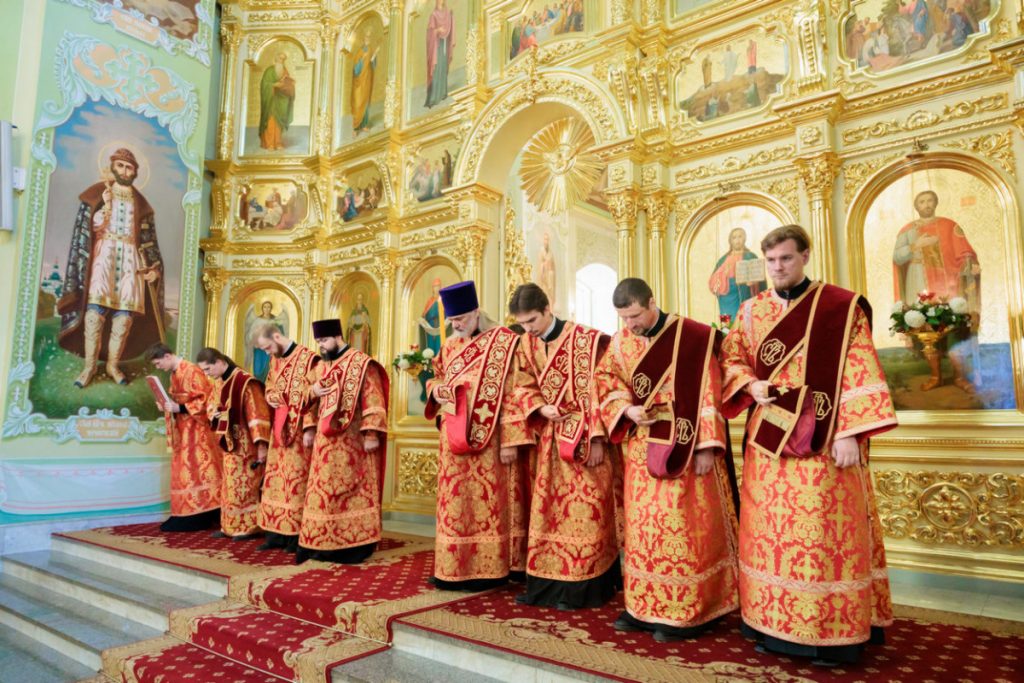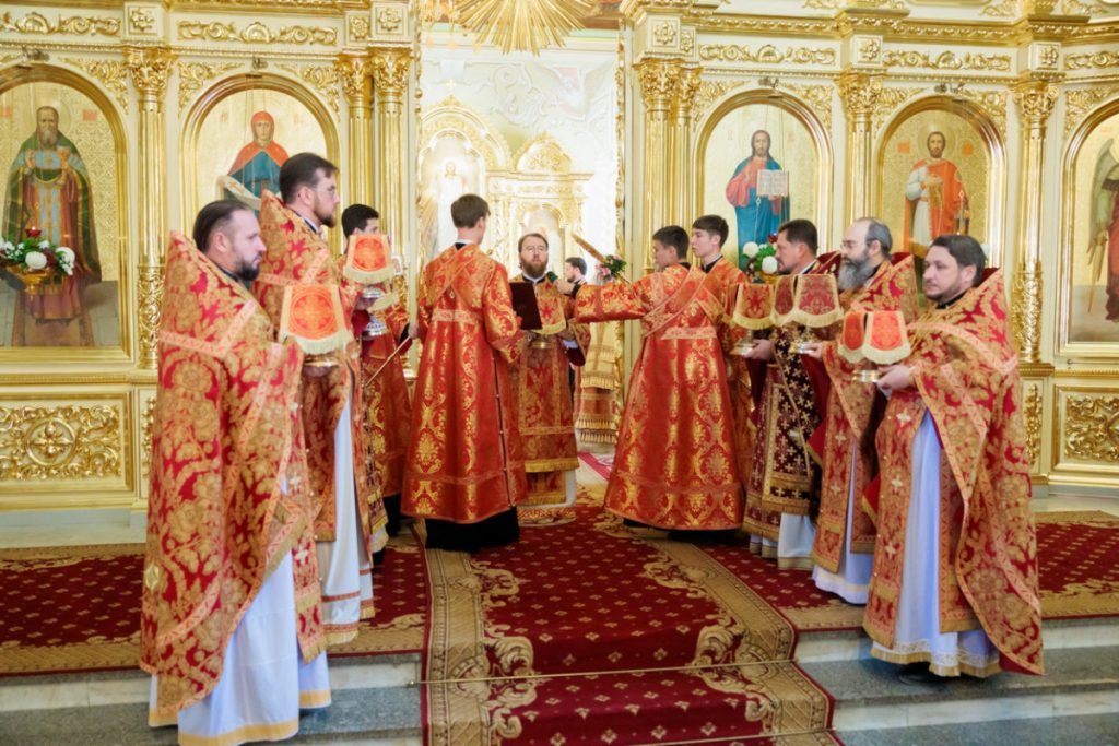 Архиереям сослужили секретарь Саратовского епархиального управления, благочинный Саратовского Центрального округа Саратовской епархии иерей Александр Чеботарёв; ректор Саратовской духовной семинарии, секретарь Епархиального совета Саратовской епархии, настоятель храма в честь иконы Божией Матери «Утоли моя печали» г. Саратова протоиерей Сергий Штурбабин; секретарь Архиерейского совета Саратовской митрополии, секретарь главы Саратовской митрополии по делам монастырей и монашествующих, благочинный монастырей Саратовской епархии, наместник, духовник Свято-Никольского мужского монастыря г. Саратова игумен Серафим (Баранов); благочинный Саратовского Северного округа, председатель финансово-хозяйственного управления Саратовской епархии, настоятель собора иерей Олег Грушин; благочинный Саратовского Западного округа, настоятель Николо-Тихвинского соборного храма г. Саратова протоиерей Димитрий Зверев; благочинный Саратовского Южного округа, настоятель храма святителя Тихона, епископа Воронежского, Задонского чудотворца, г. Саратова протоиерей Александр Домрачёв; клирик собора, директор Покровской православной классической гимназии имени святого благоверного князя Александра Невского г. Саратова иерей Ярослав Коздринь; секретарь Покровского епархиального управления, настоятель храма Покрова Божией Матери на Волге г. Покровска (Энгельса) иерей Аркадий Махсумов (Покровская епархия); благочинный Саратовского Северо-Западного округа, помощник епархиального архиерея по богослужебным вопросам, настоятель храма святого великомученика Георгия Победоносца г. Саратова иерей Алексий Булеков; секретарь главы Саратовской митрополии, благочинный Саратовского Восточного округа, руководитель епархиального отдела по взаимоотношениям Церкви с обществом и СМИ, настоятель Свято-Троицкого кафедрального собора г. Саратова иерей Александр Бородовицын; благочинный Саратовского Юго-Западного округа, заместитель председателя финансово-хозяйственного управления Саратовской епархии, настоятель храма Всех святых, в земле Русской просиявших, г.Саратова иерей Павел Тараканов; иерей Максим Ивчук (Балаковская епархия); заместитель секретаря Саратовского епархиального управления, заместитель благочинного Саратовского Центрального округа, ключарь соборного храма святителя Спиридона Тримифунтского г. Саратова иерей Владимир Петриченко; клирик Свято-Троицкого кафедрального собора г. Саратова протодиакон Александр Пушкарёв; клирик собора диакон Иоанн Пушкарёв; клирик Свято-Троицкого кафедрального собора г. Саратова диакон Иоанн Новиков; директор Архиерейского мужского хора Саратовской митрополии, клирик Свято-Духовского собора г. Саратова диакон Иоанн Горбач; диакон Тимофей Улямаев (Балаковская епархия); клирик собора , заместитель руководителя епархиального отдела по делам молодежи диакон Даниил Пронин.