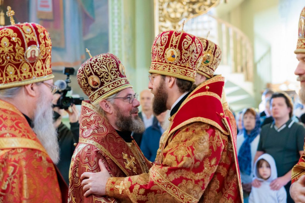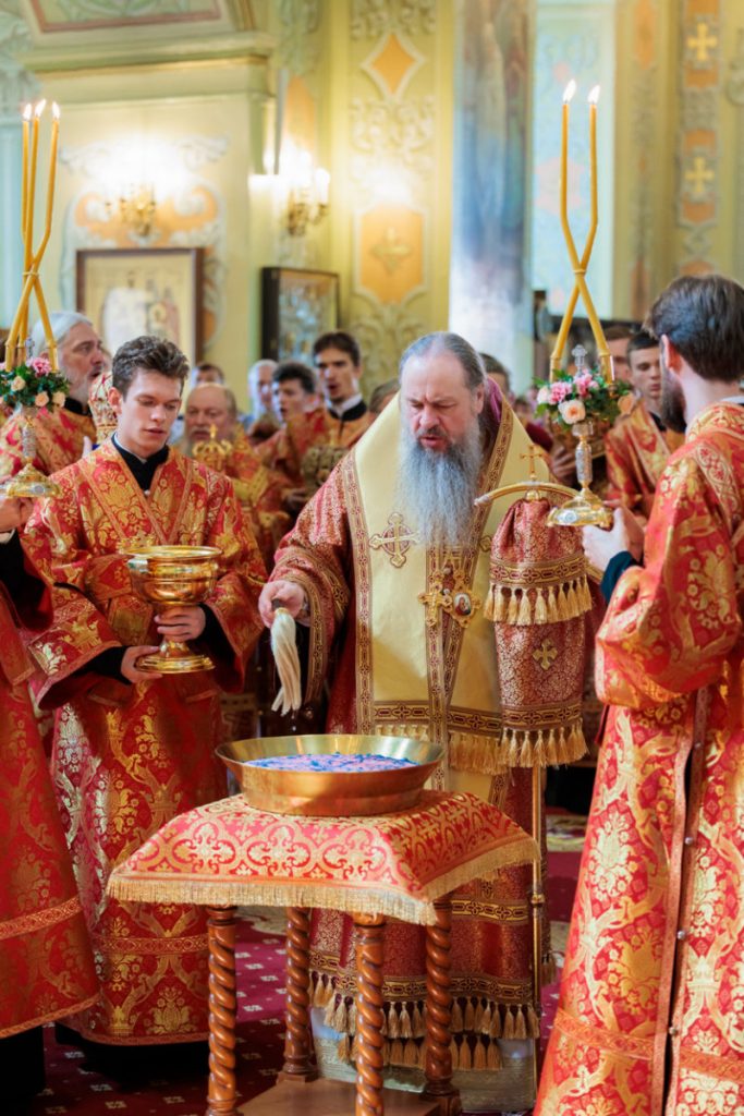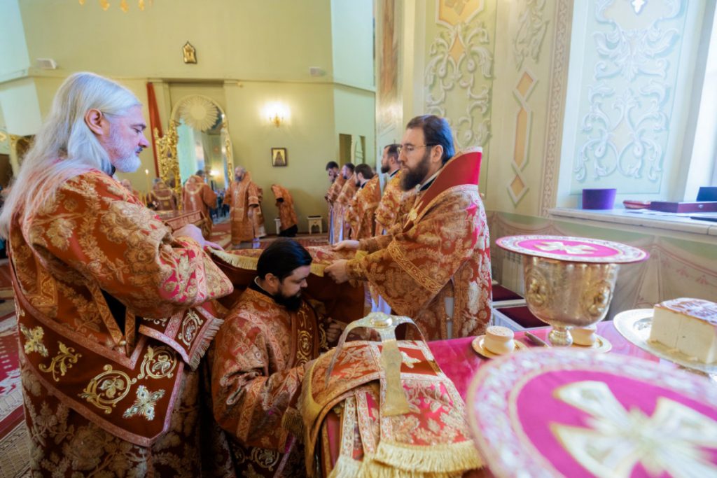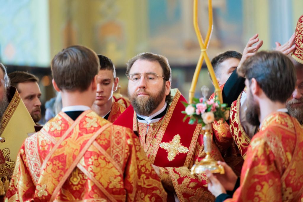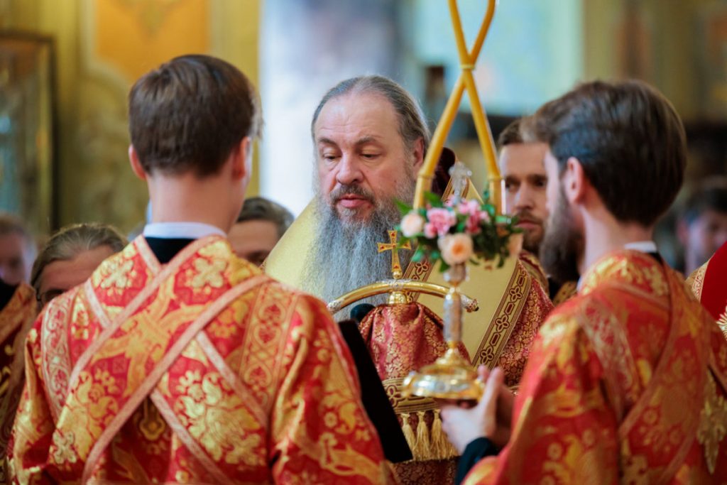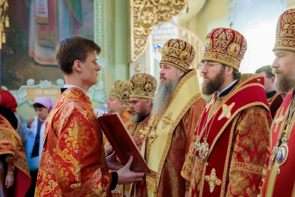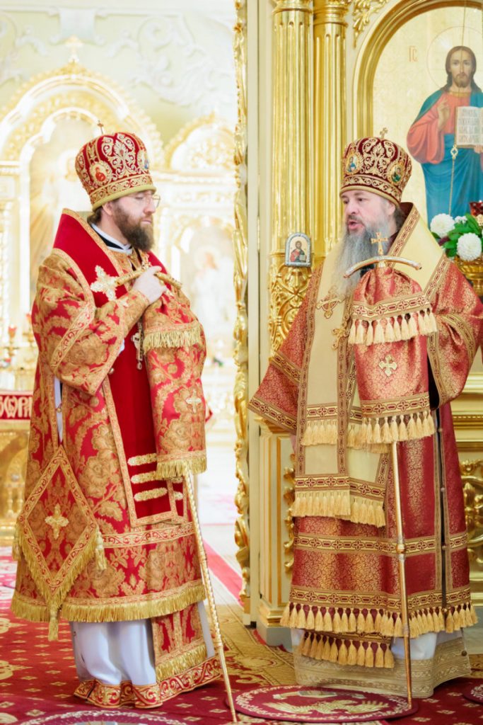 Архиереям сослужили секретарь Саратовского епархиального управления, благочинный Саратовского Центрального округа Саратовской епархии иерей Александр Чеботарёв; ректор Саратовской духовной семинарии, секретарь Епархиального совета Саратовской епархии, настоятель храма в честь иконы Божией Матери «Утоли моя печали» г. Саратова протоиерей Сергий Штурбабин; секретарь Архиерейского совета Саратовской митрополии, секретарь главы Саратовской митрополии по делам монастырей и монашествующих, благочинный монастырей Саратовской епархии, наместник, духовник Свято-Никольского мужского монастыря г. Саратова игумен Серафим (Баранов); благочинный Саратовского Северного округа, председатель финансово-хозяйственного управления Саратовской епархии, настоятель собора иерей Олег Грушин; благочинный Саратовского Западного округа, настоятель Николо-Тихвинского соборного храма г. Саратова протоиерей Димитрий Зверев; благочинный Саратовского Южного округа, настоятель храма святителя Тихона, епископа Воронежского, Задонского чудотворца, г. Саратова протоиерей Александр Домрачёв; клирик собора, директор Покровской православной классической гимназии имени святого благоверного князя Александра Невского г. Саратова иерей Ярослав Коздринь; секретарь Покровского епархиального управления, настоятель храма Покрова Божией Матери на Волге г. Покровска (Энгельса) иерей Аркадий Махсумов (Покровская епархия); благочинный Саратовского Северо-Западного округа, помощник епархиального архиерея по богослужебным вопросам, настоятель храма святого великомученика Георгия Победоносца г. Саратова иерей Алексий Булеков; секретарь главы Саратовской митрополии, благочинный Саратовского Восточного округа, руководитель епархиального отдела по взаимоотношениям Церкви с обществом и СМИ, настоятель Свято-Троицкого кафедрального собора г. Саратова иерей Александр Бородовицын; благочинный Саратовского Юго-Западного округа, заместитель председателя финансово-хозяйственного управления Саратовской епархии, настоятель храма Всех святых, в земле Русской просиявших, г.Саратова иерей Павел Тараканов; иерей Максим Ивчук (Балаковская епархия); заместитель секретаря Саратовского епархиального управления, заместитель благочинного Саратовского Центрального округа, ключарь соборного храма святителя Спиридона Тримифунтского г. Саратова иерей Владимир Петриченко; клирик Свято-Троицкого кафедрального собора г. Саратова протодиакон Александр Пушкарёв; клирик собора диакон Иоанн Пушкарёв; клирик Свято-Троицкого кафедрального собора г. Саратова диакон Иоанн Новиков; директор Архиерейского мужского хора Саратовской митрополии, клирик Свято-Духовского собора г. Саратова диакон Иоанн Горбач; диакон Тимофей Улямаев (Балаковская епархия); клирик собора , заместитель руководителя епархиального отдела по делам молодежи диакон Даниил Пронин.