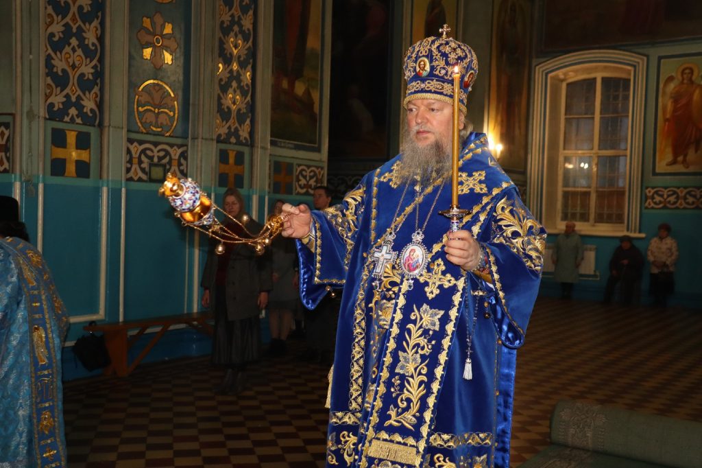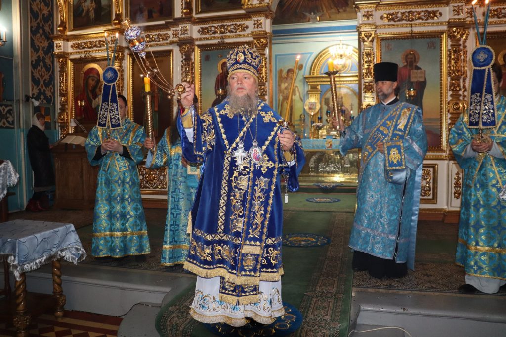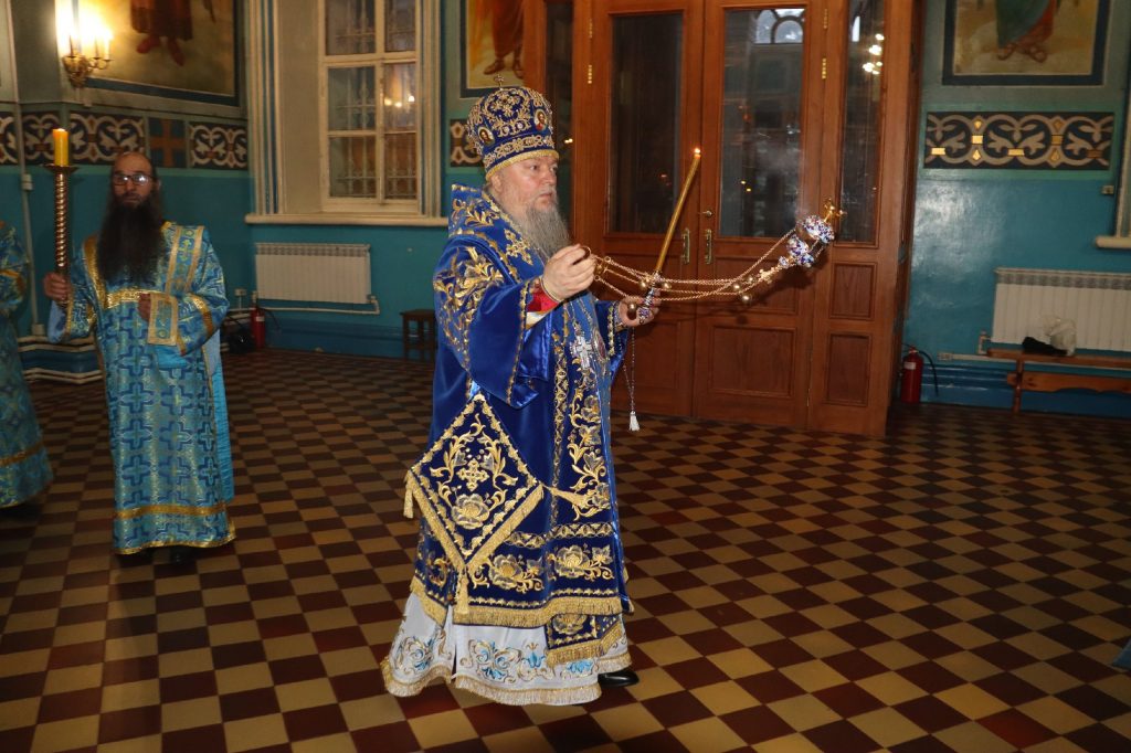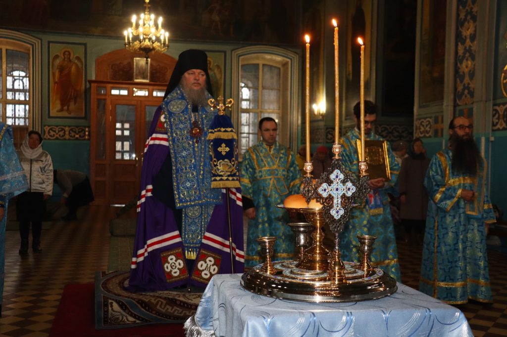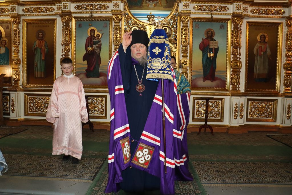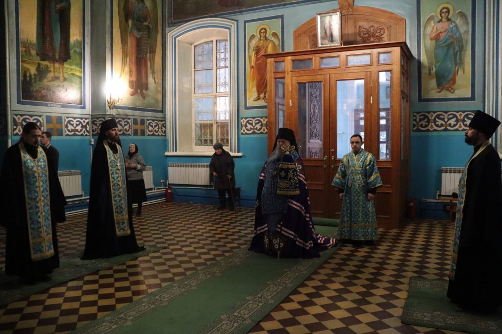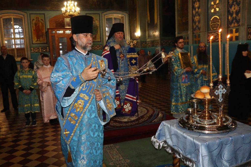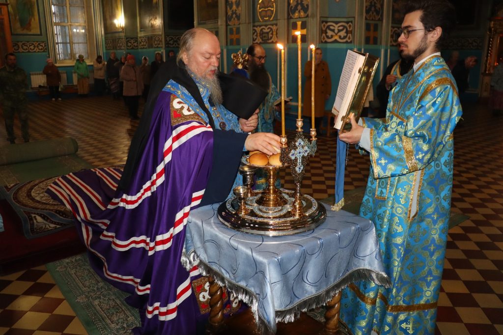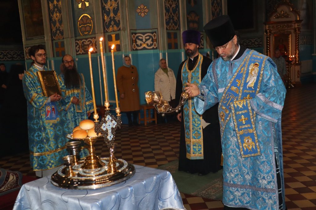 За вечерним богослужением епископ Митрофан совершил литию с освящением хлебов, пшеницы, вина и елея.