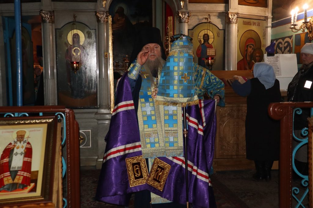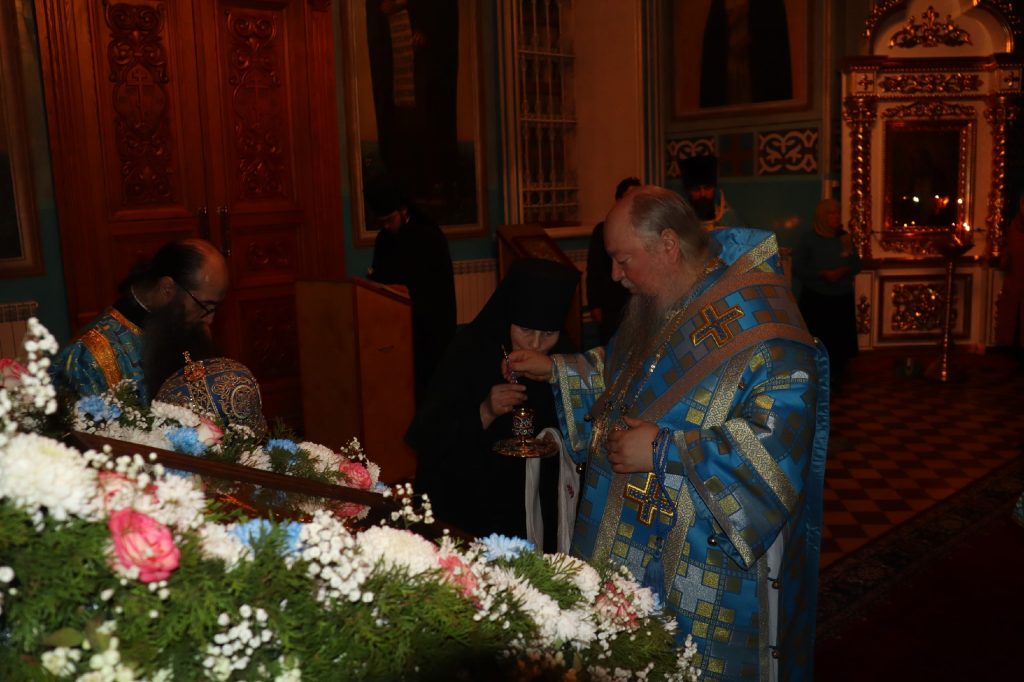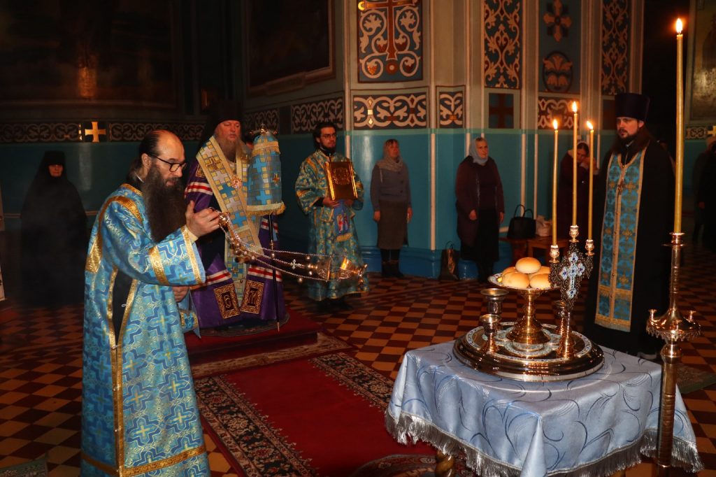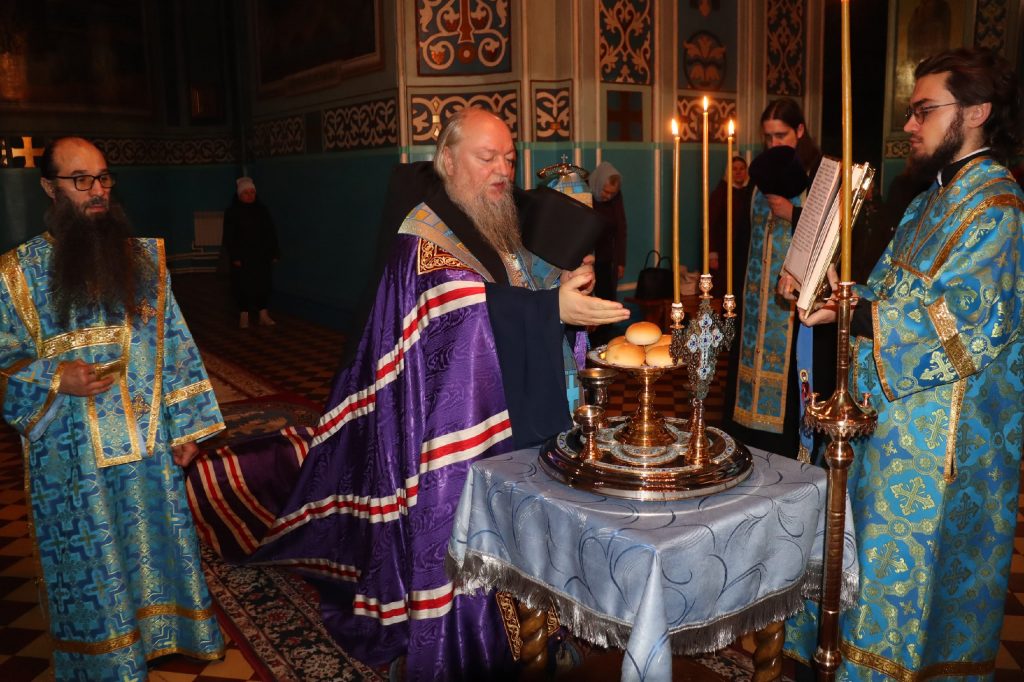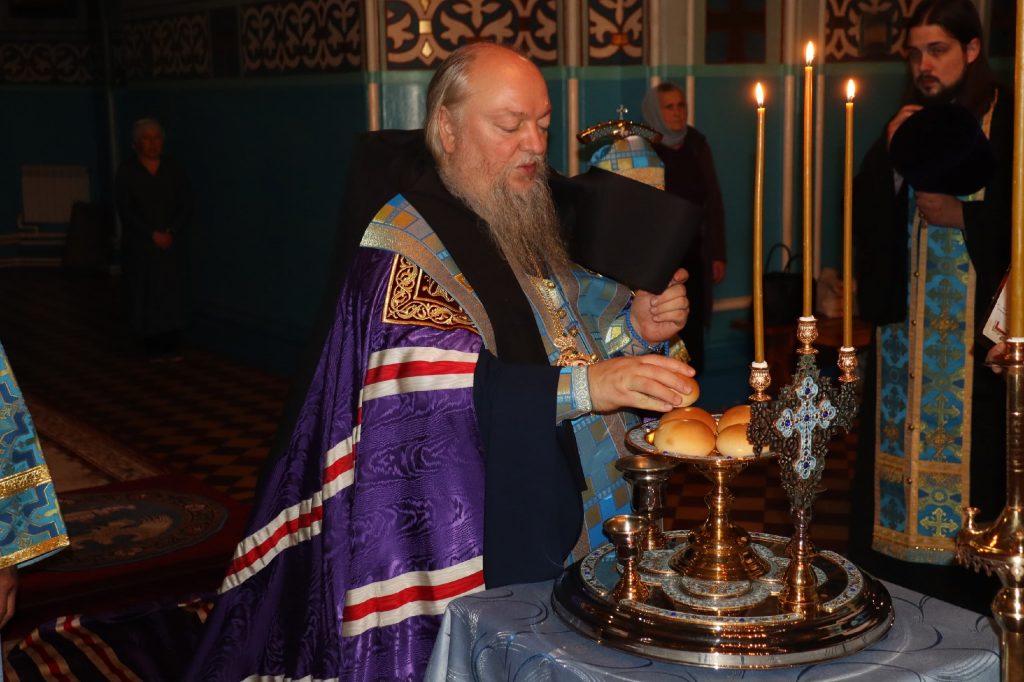 Во время вечерни Преосвященнейший Владыка Митрофан совершил литию с освящением хлебов, пшеницы, вина и елея.
