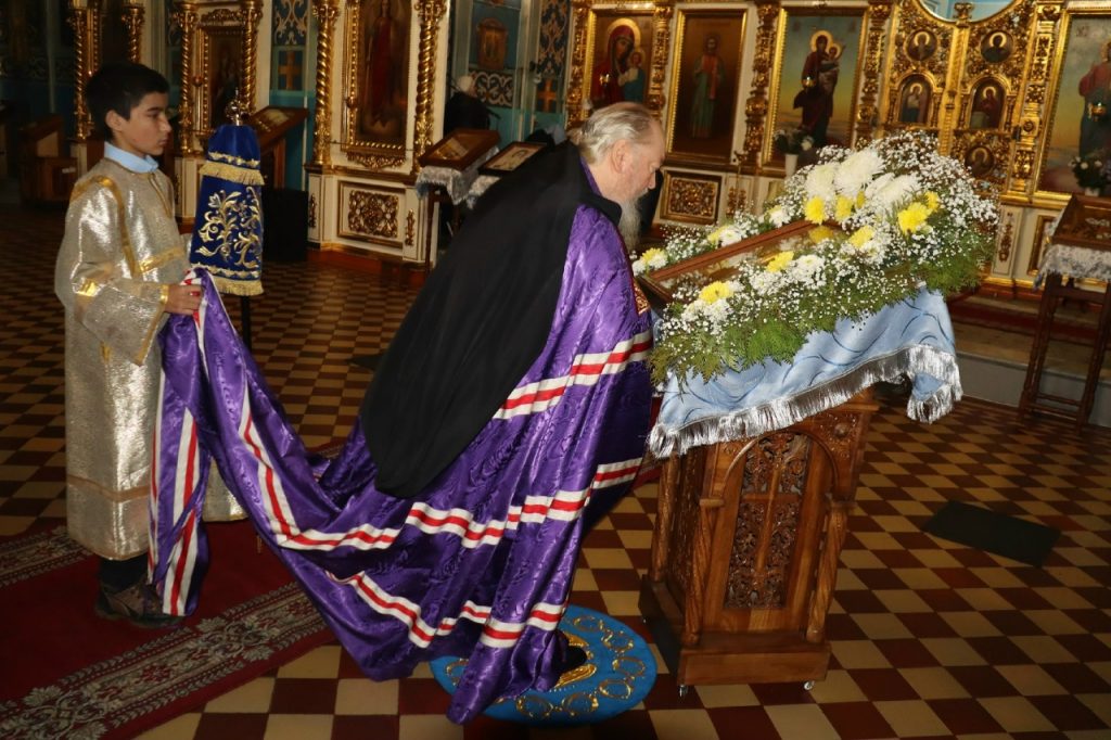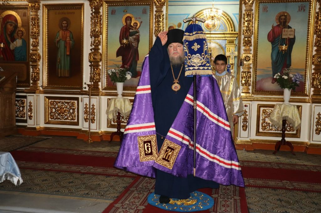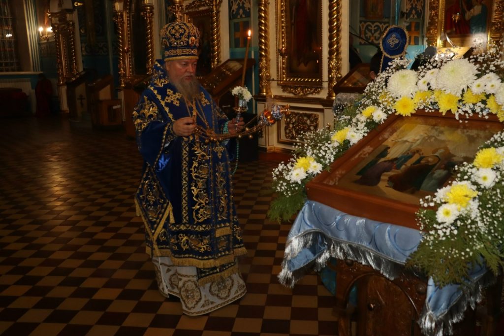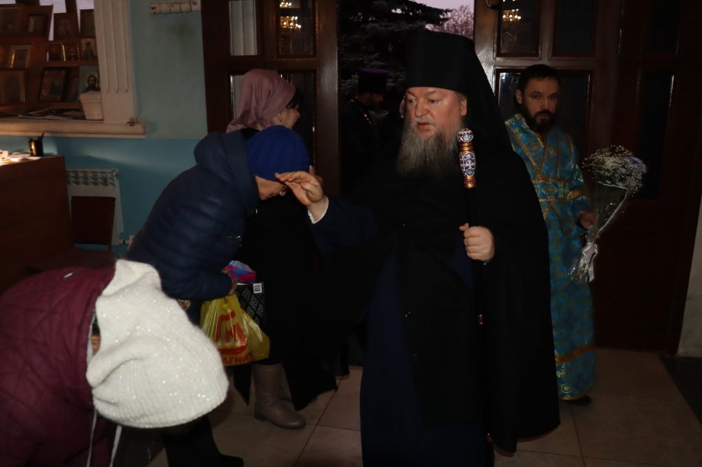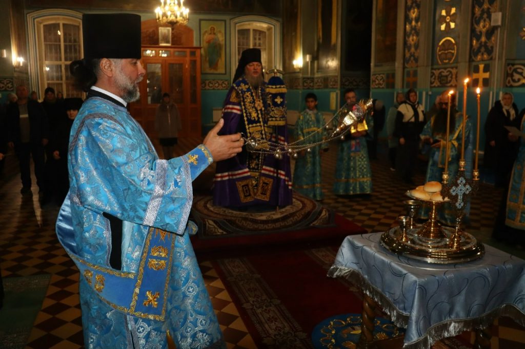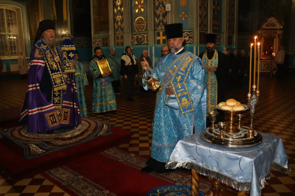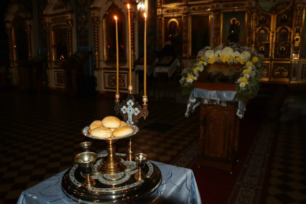 Во время вечерни епископ Митрофан совершил литию с освящением хлебов, пшеницы, вина и елея.