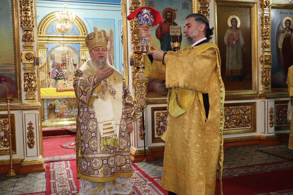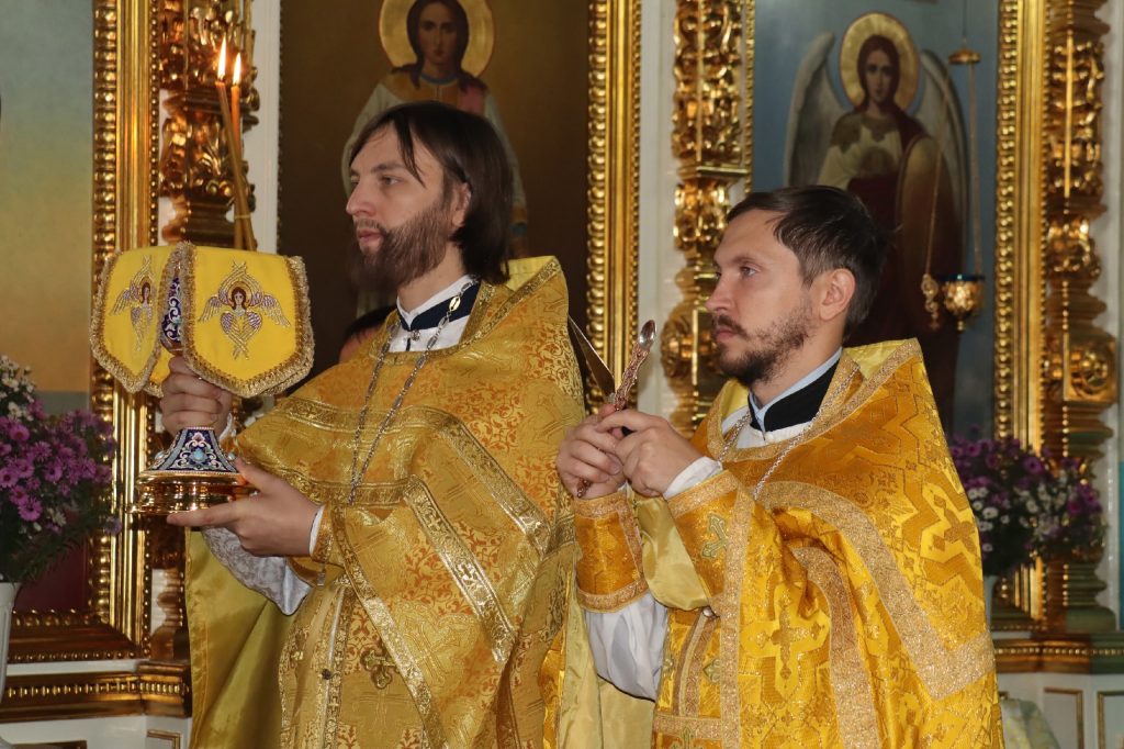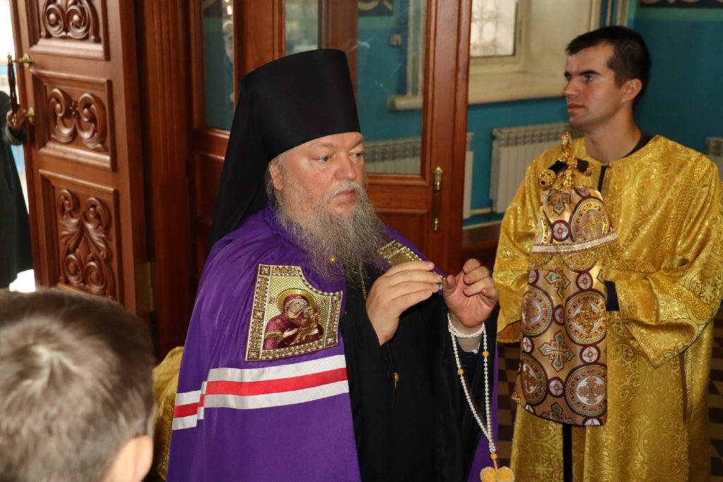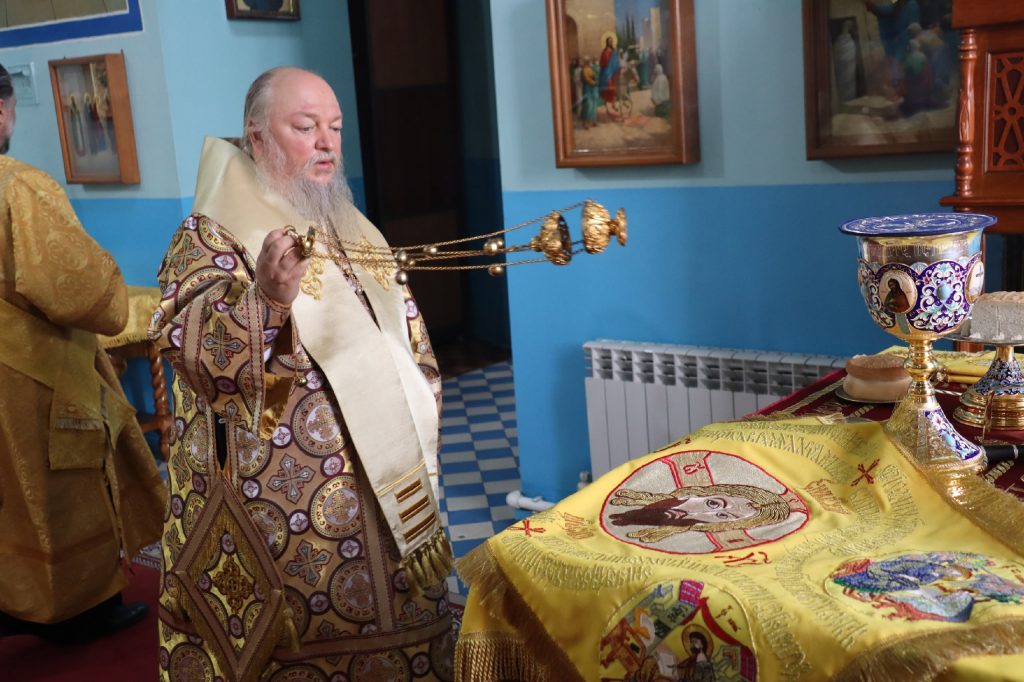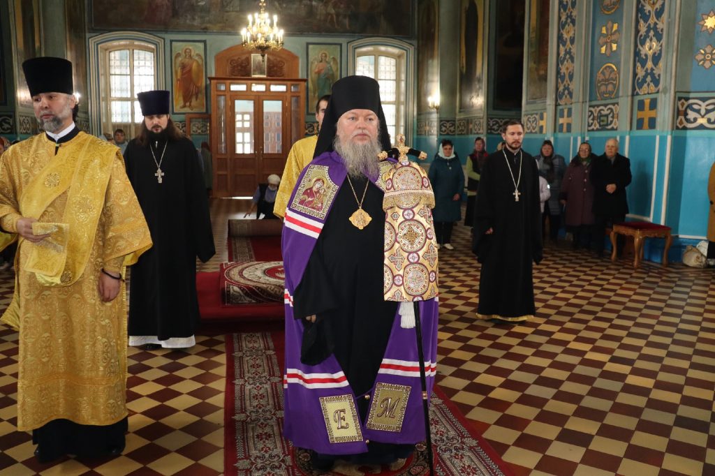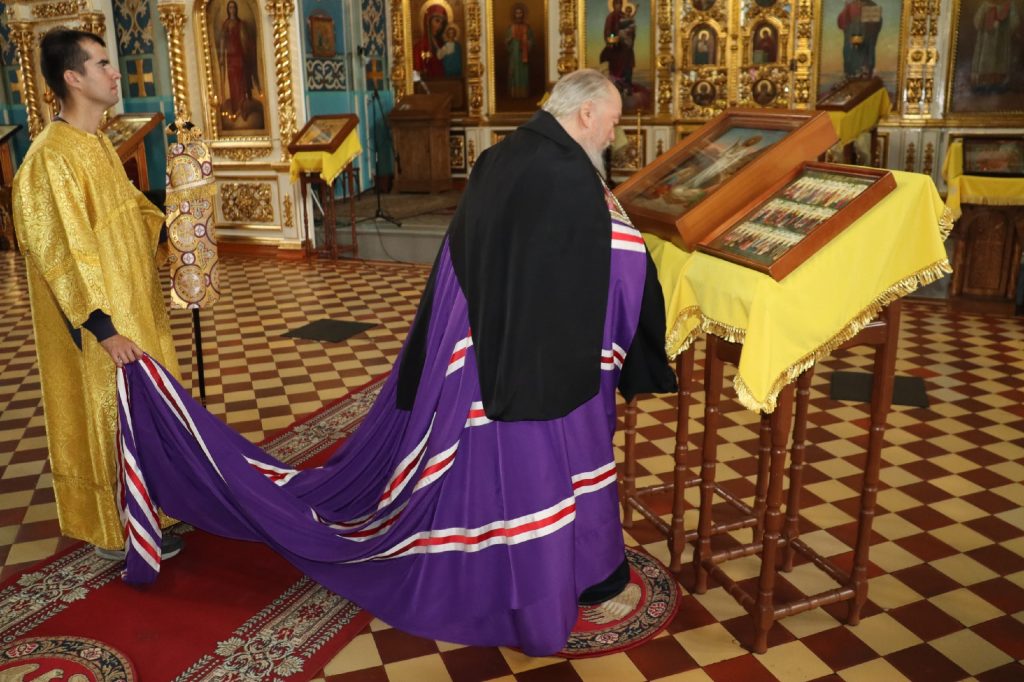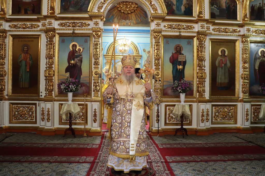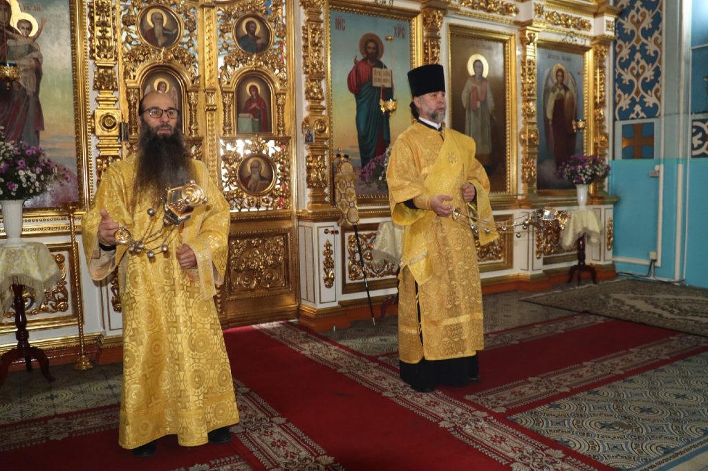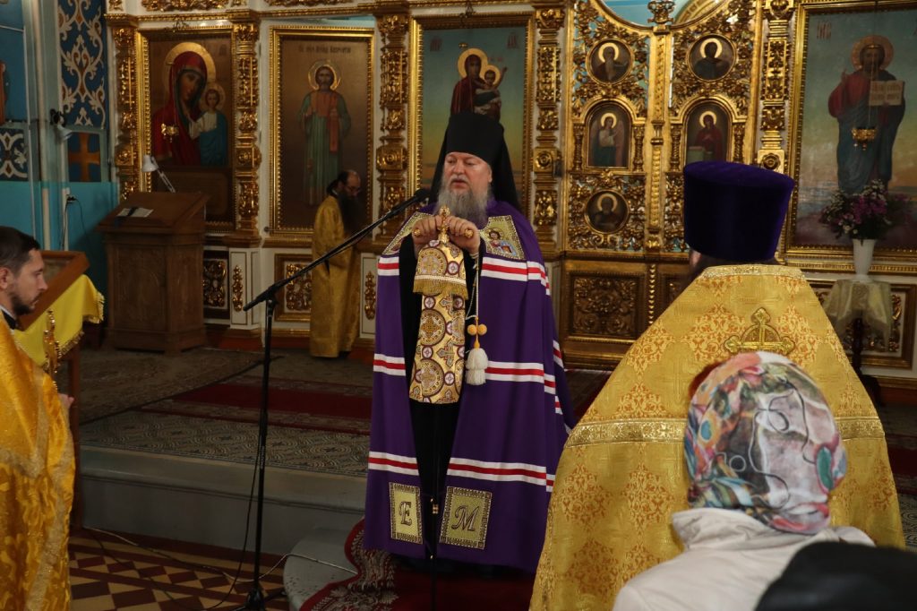 Его Преосвященству сослужили: иеромонах Амвросий (Макаров), врио. секретаря Епархиального Управления; клирик собора и руководитель епархиального отдела религиозного образования и катехизации иерей Александр Федин; иерей Михаил Клопов; иеродиакон Иннокентий (Ганин), диакон Владимир Эрекайкин.