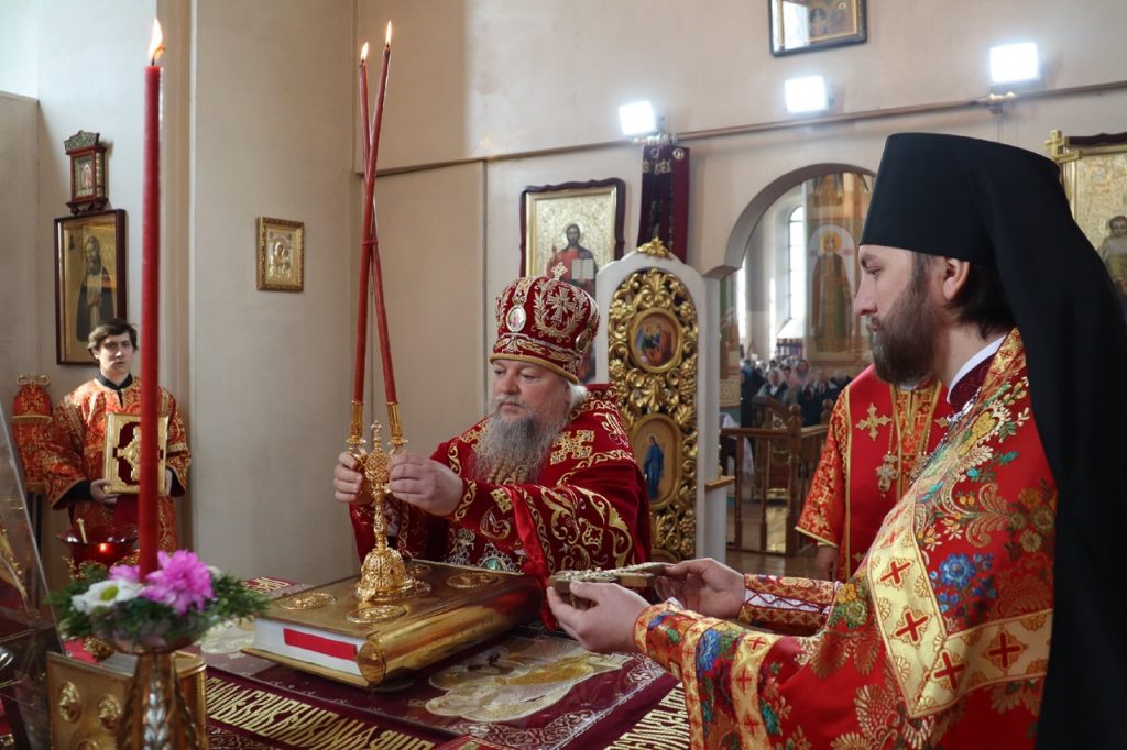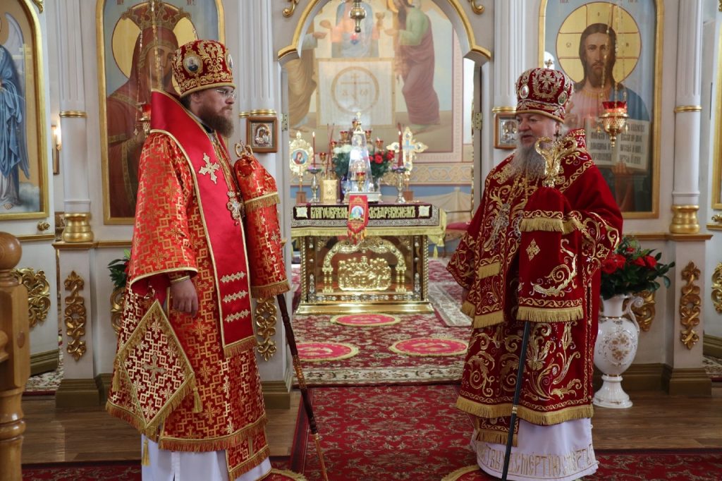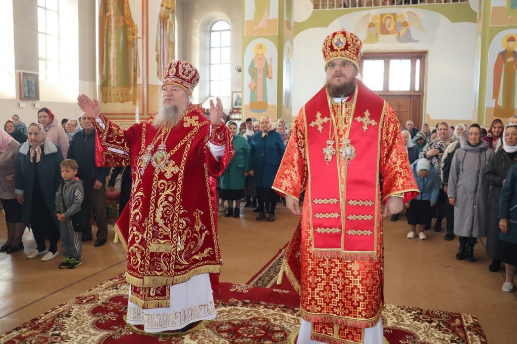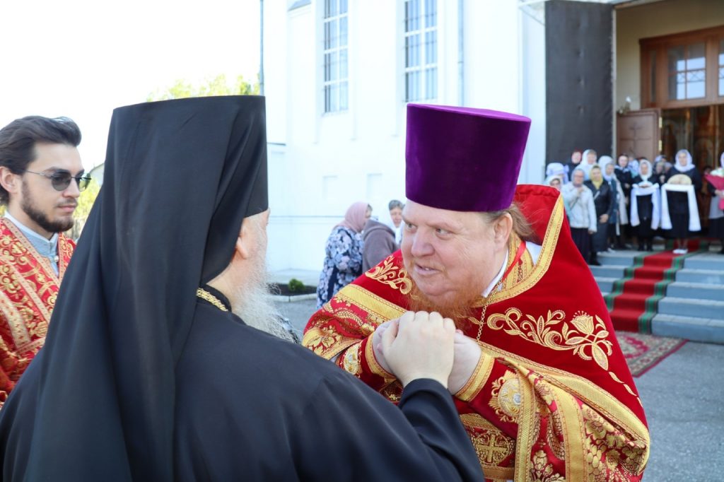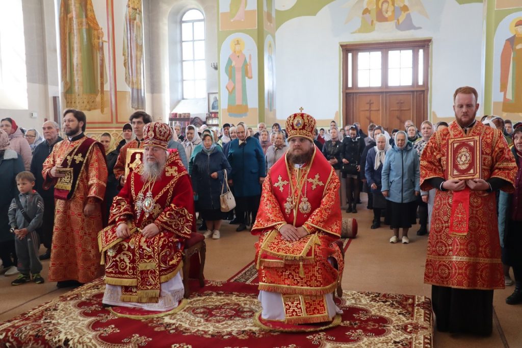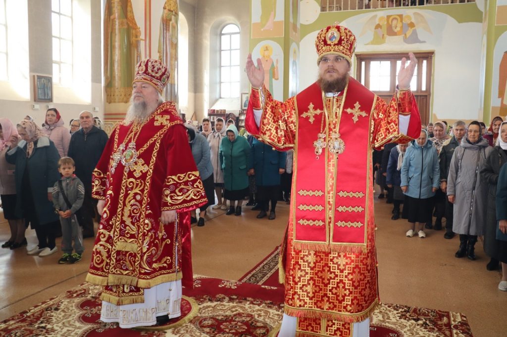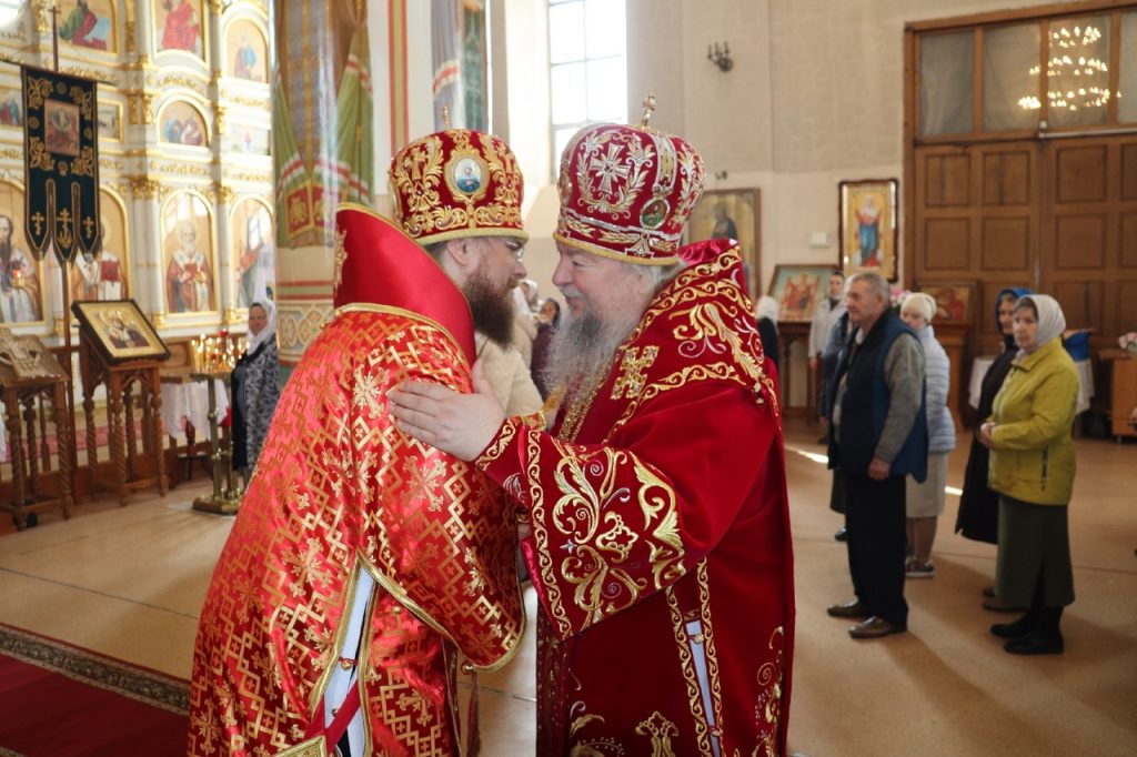 По отпусте Литургии епископ Митрофан поздравил молящихся с праздником Пасхи Христовой и обратился к епископу Сергию с приветственным словом. На память о совместном служении Владыка Митрофан преподнёс в дар наперсный крест и панагию с изображением Тихвинской Керенской иконы Божией Матери.