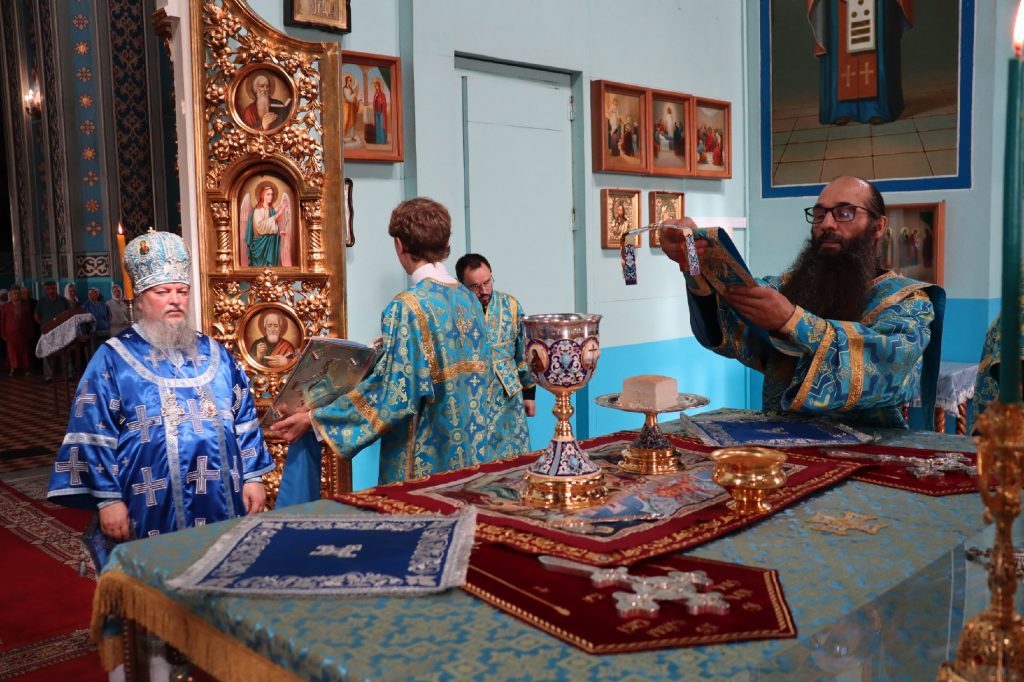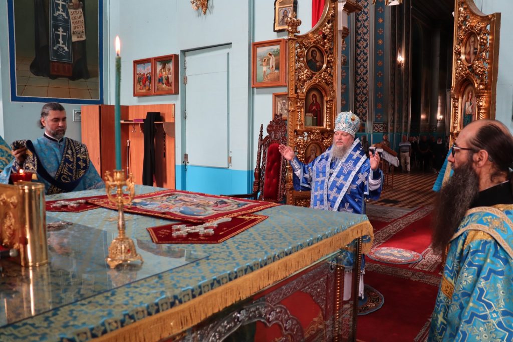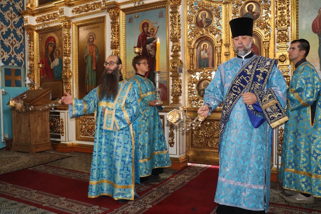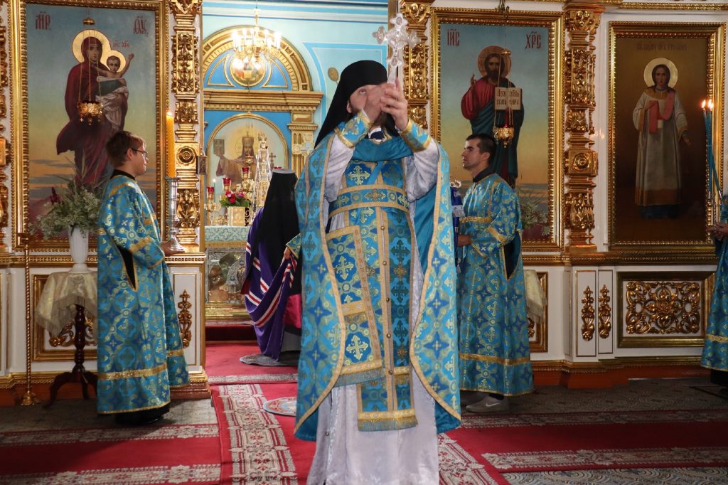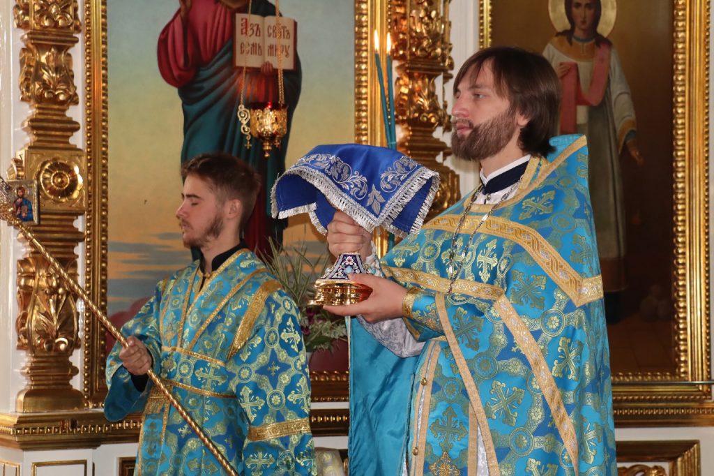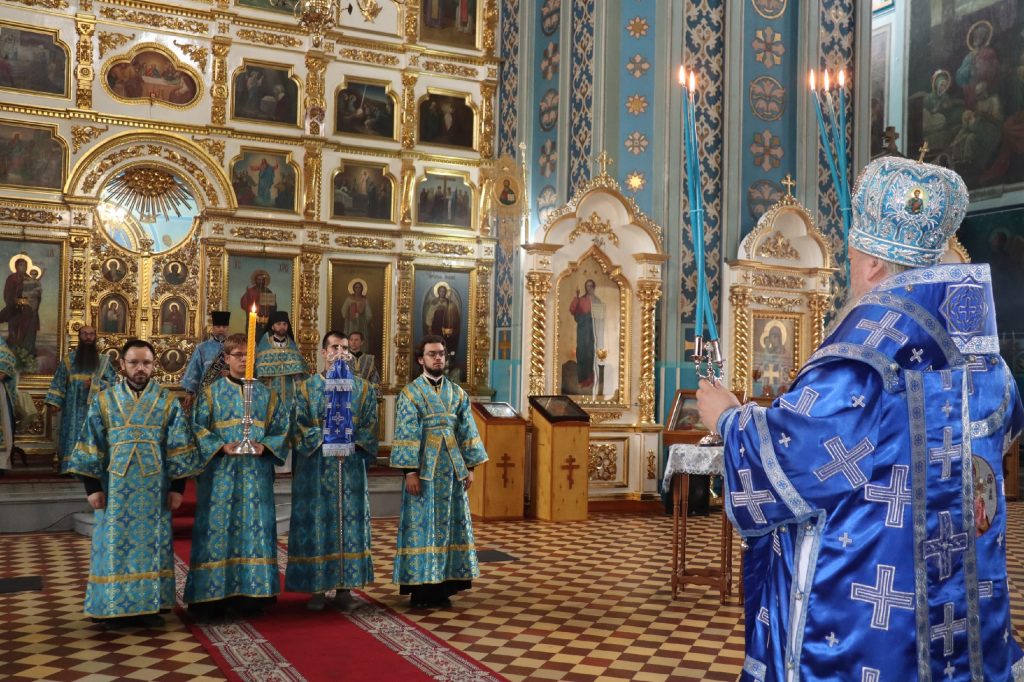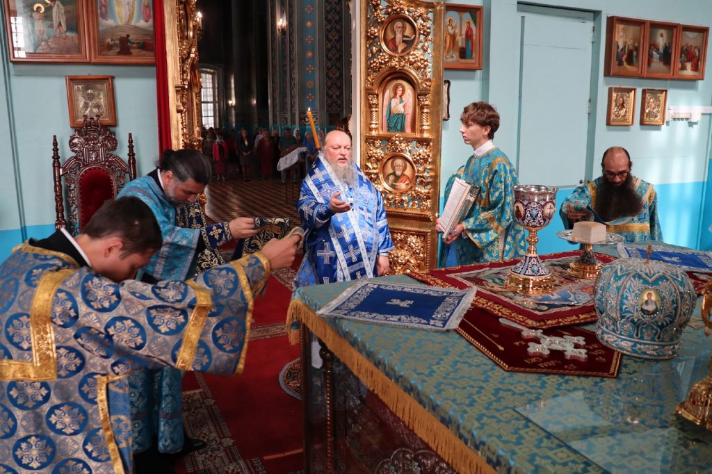 Его Преосвященству сослужили: иеромонах Амвросий (Макаров), врио. секретаря Епархиального Управления; клирик собора и руководитель епархиального отдела религиозного образования и катехизации иерей Александр Федин; иеродиакон Иннокентий (Ганин), диакон Владимир Эрекайкин, диакон Михаил Клопов.