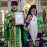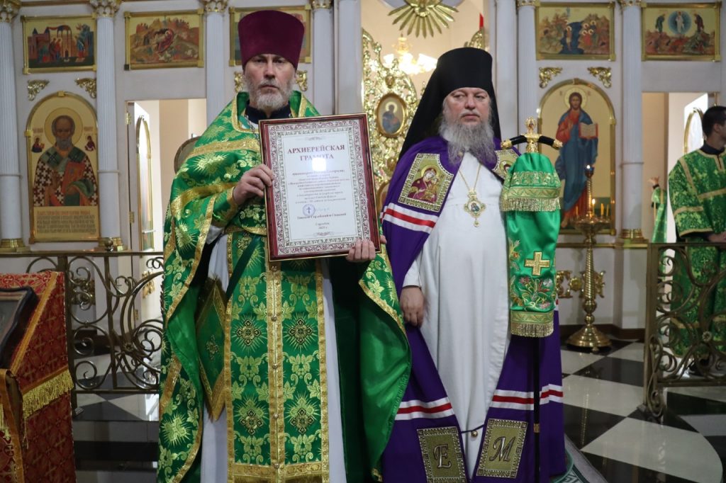 Затем во внимание к усердным трудам на благо Церкви епископ Митрофан наградил настоятеля храма Казанской иконы Божией Матери протоиерея Романа Скворцова Архиерейской грамотой.