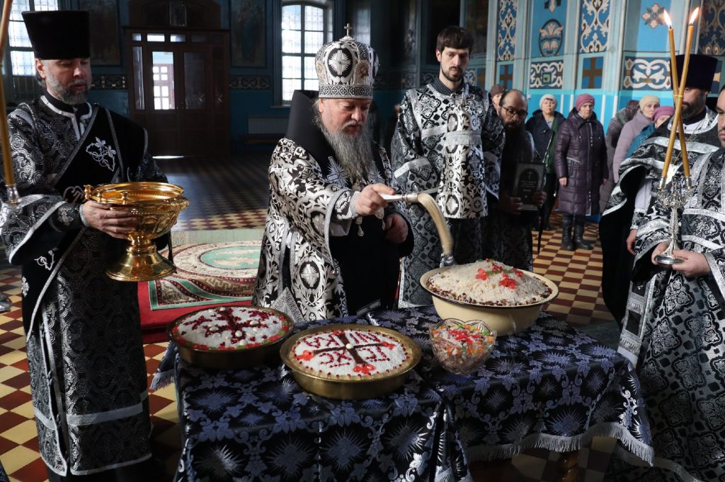 По заамвонной молитве епископ Сердобский и Спасский Митрофан возглавил молебное пение великомученику Феодору Тирону и по традиции совершил освящение колива.
