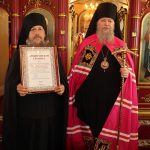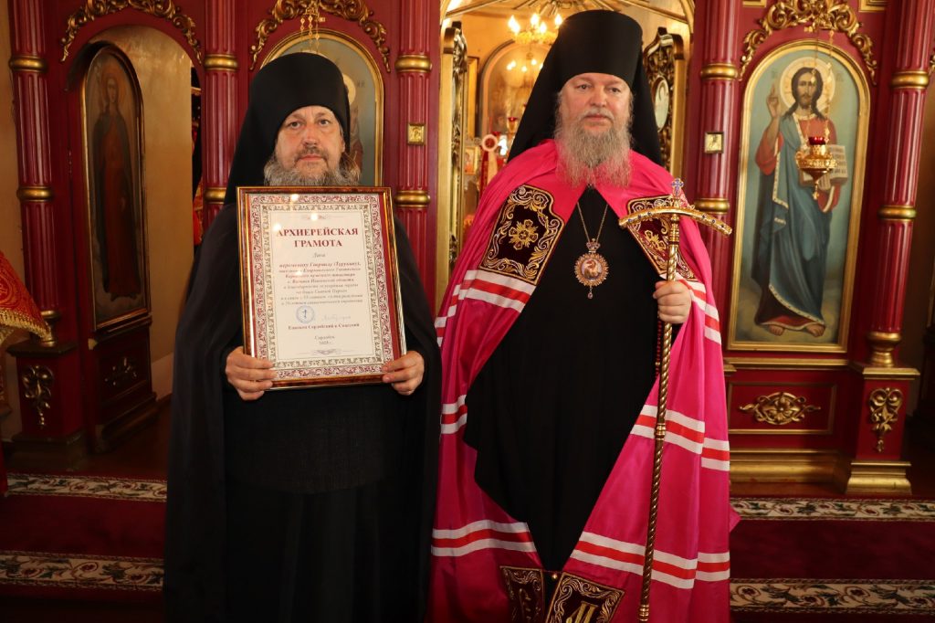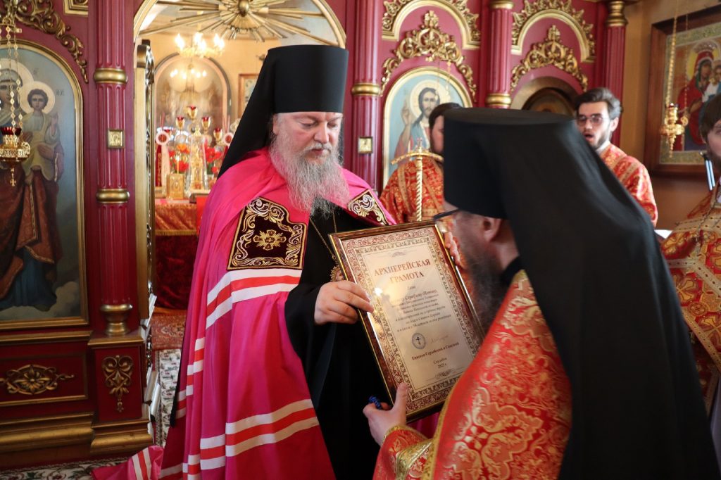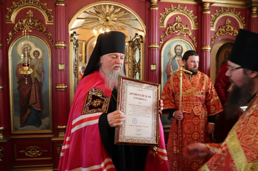 Затем состоялось вручение церковных наград. Во внимание к усердным трудам во славу Святой Церкви Преосвященнейший Владыка Митрофан вручил Архиерейские грамоты: и. о. наместника Епархиального Тихвинского Керенского мужского монастыря с.Вадинска иеромонаху Питириму (Толмачеву); насельникам Епархиального Тихвинского Керенского мужского монастыря с.Вадинска игумену Серафиму (Попову) и иеромонаху Гавриилу (Турукину).