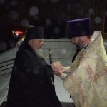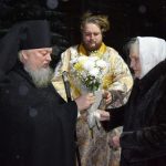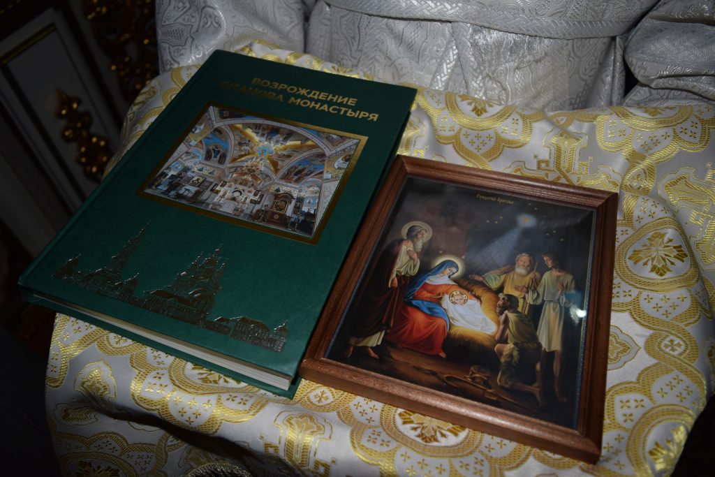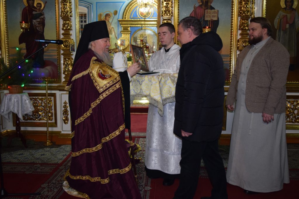 Затем Преосвященнейший Владыка Митрофан и Александр Вячеславович Бедикин обменялись поздравлениями и рождественскими подарками.