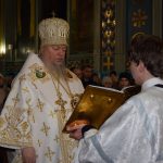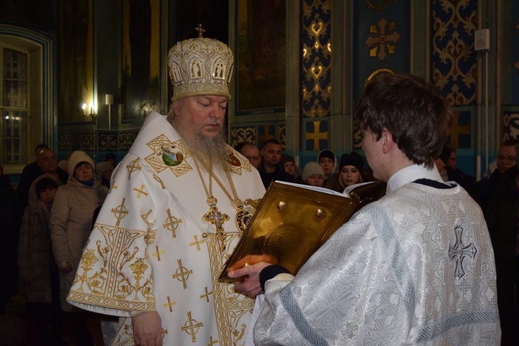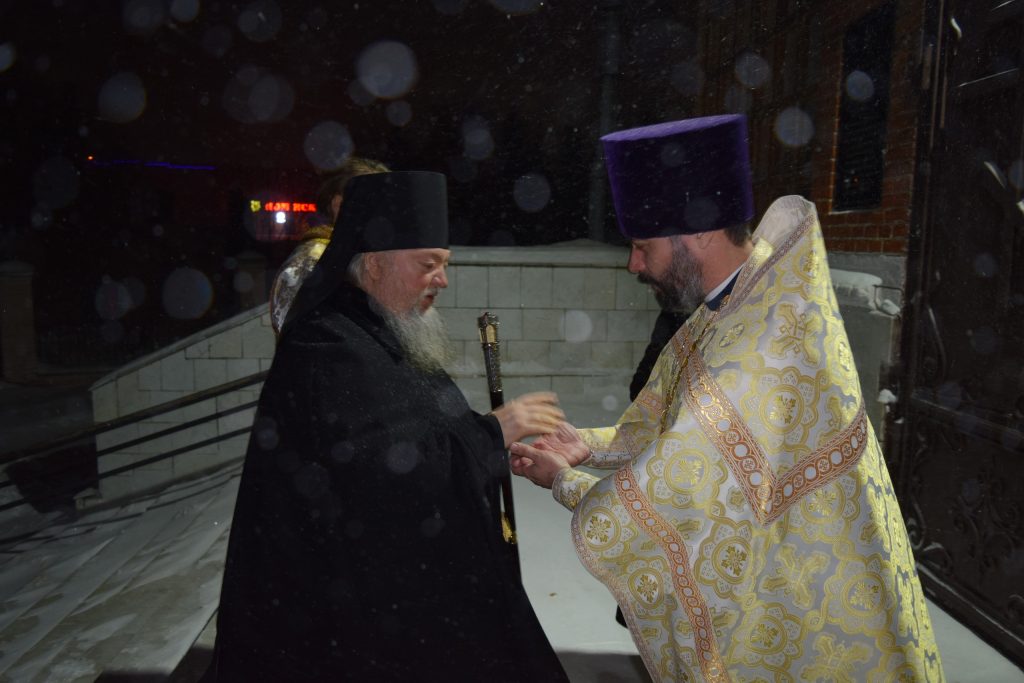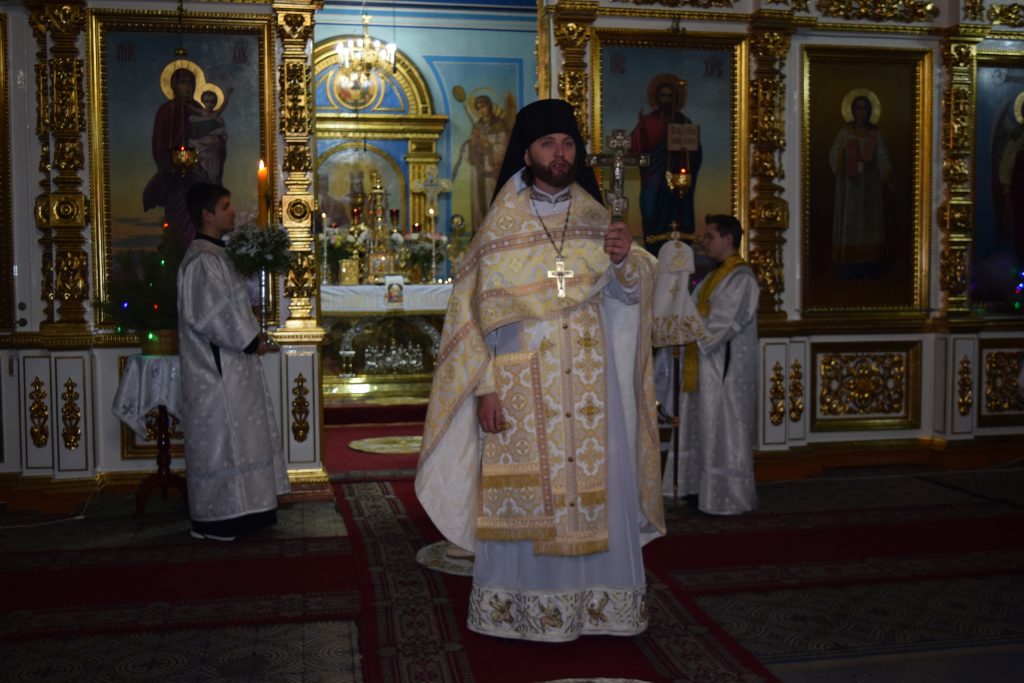 После чтения Евангелия иеромонах Амвросий (Макаров), врио. секретаря Епархиального Управления, огласил верующим Рождественское послание Святейшего Патриарха Московского и всея Руси Кирилла.
