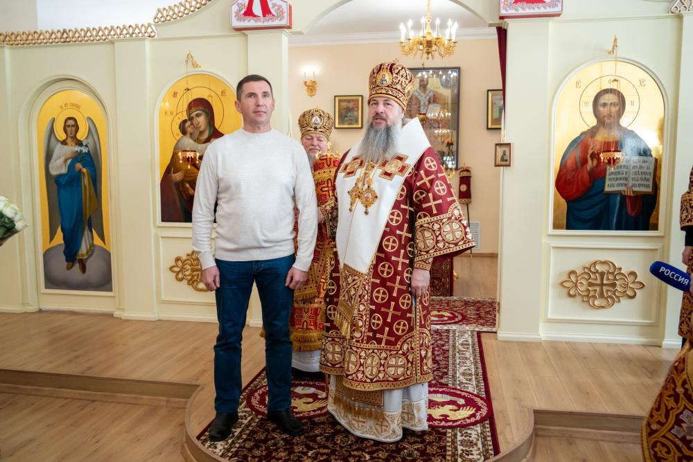 От лица клира и прихожан со словами поздравления к тезоименитому владыке обратился секретарь Пензенской епархии протоиерей Павел Матюшечкин и преподнес ему икону Божией Матери и букет цветов.