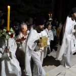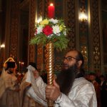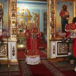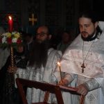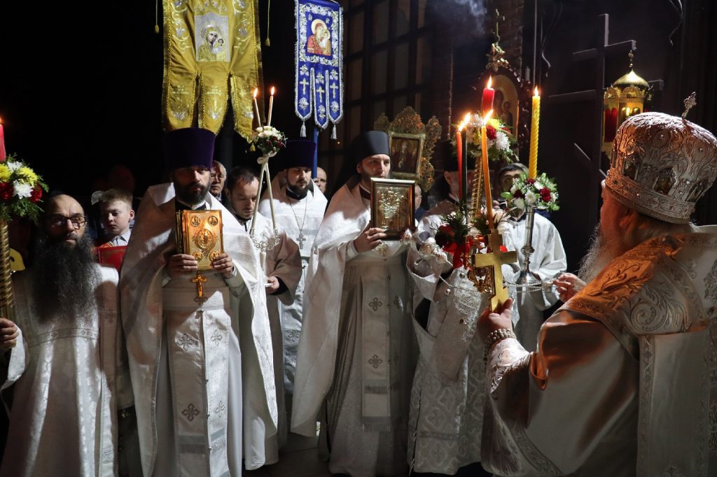 По традиции после пения пасхального канона в алтаре епископ Митрофан и духовенство сменили белые облачения на красные.