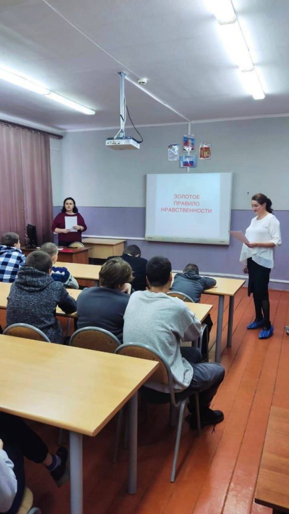 10 ноября 2025 года в рамках региональных Рождественских образовательных чтений сотрудники отдела по катехизации и православному образованию Поимского благочиния провели воспитательный час для учащихся 7-9 классов ГКОУ «Поимская школа-интернат» на тему » Золотое правило нравственности».