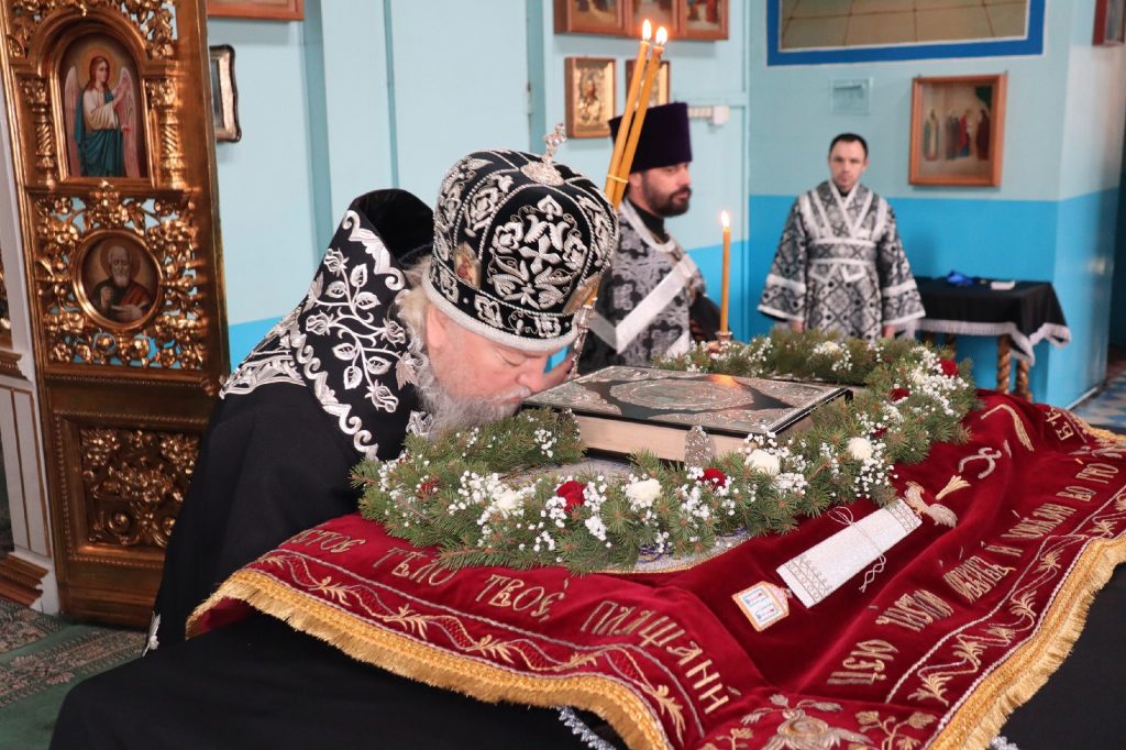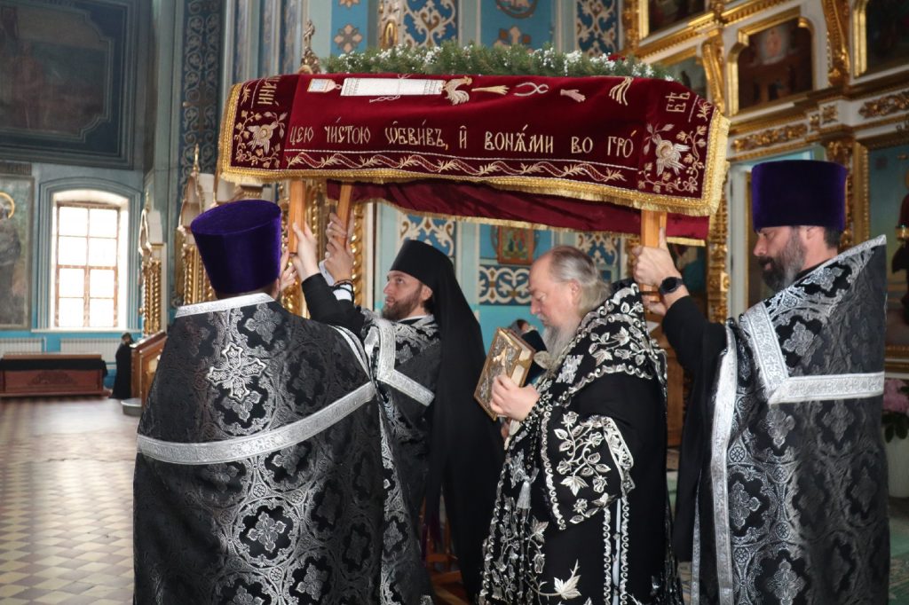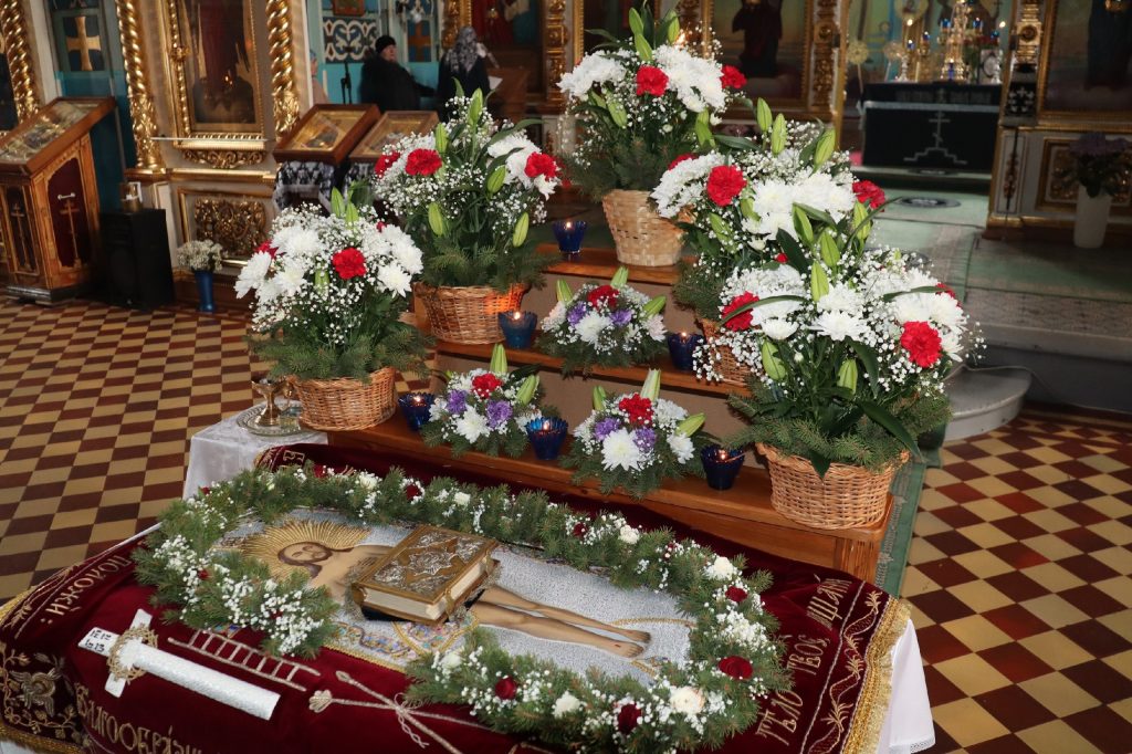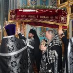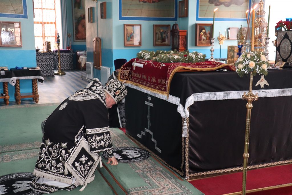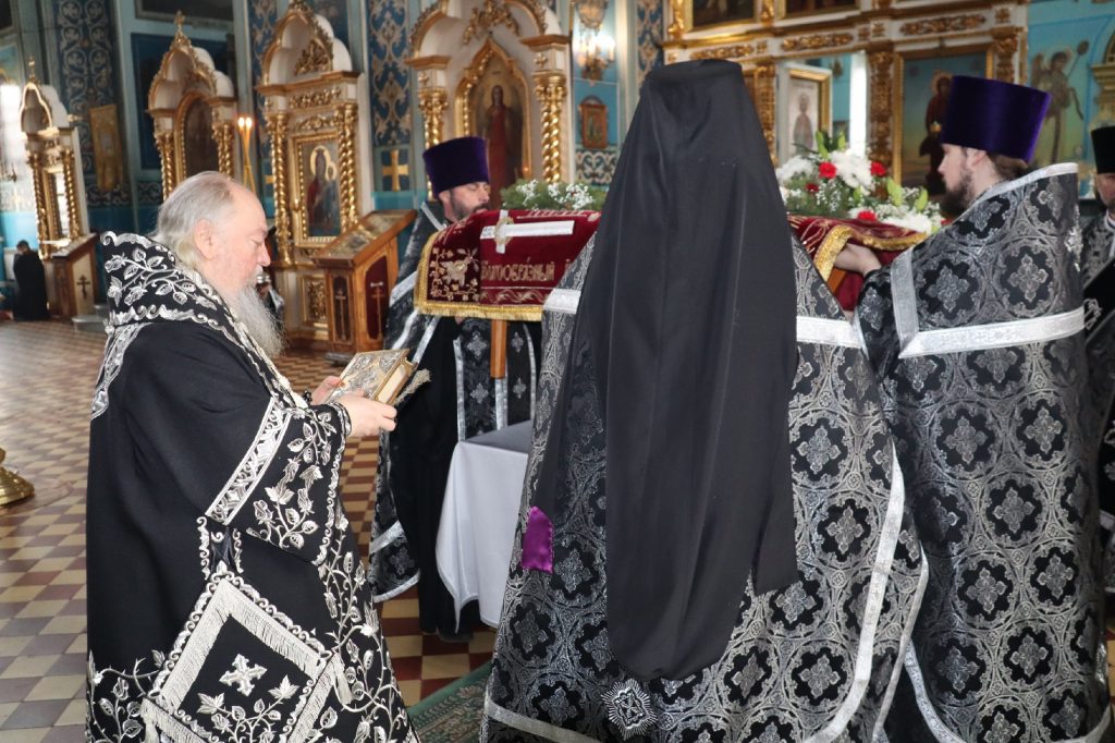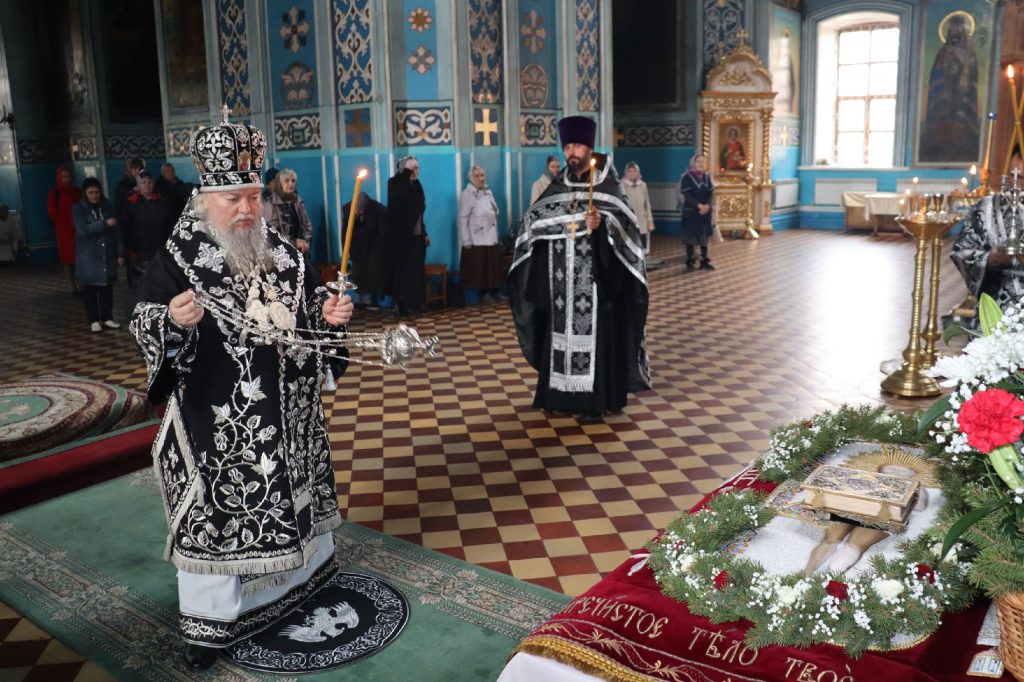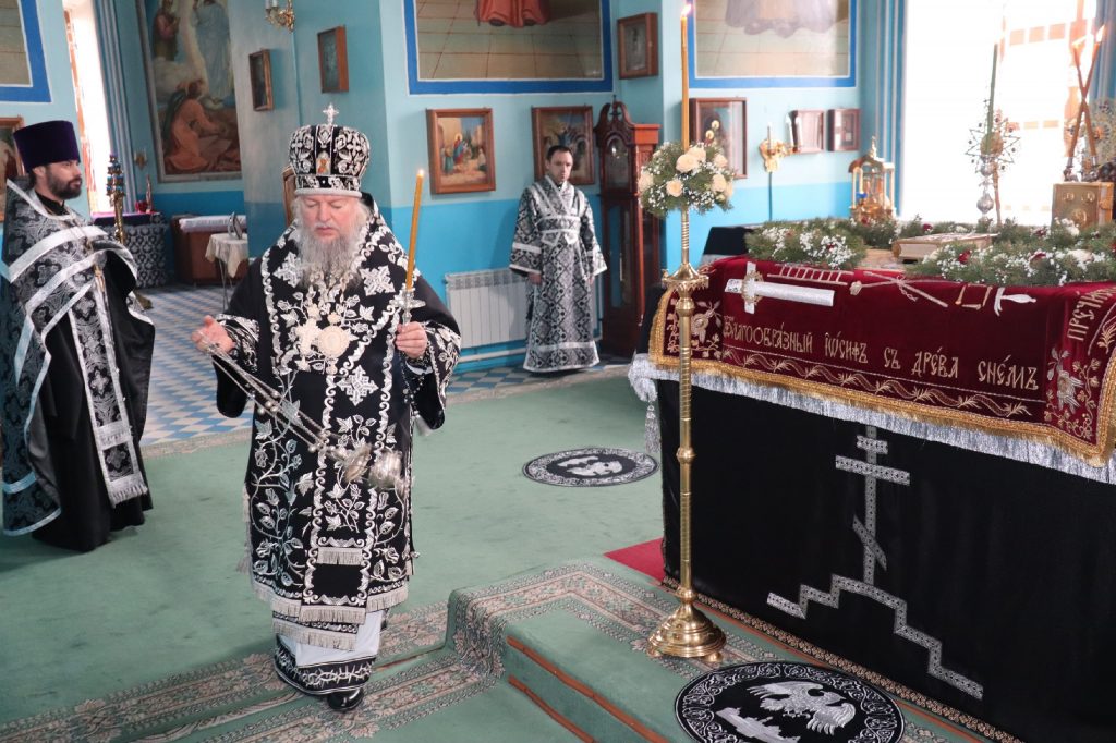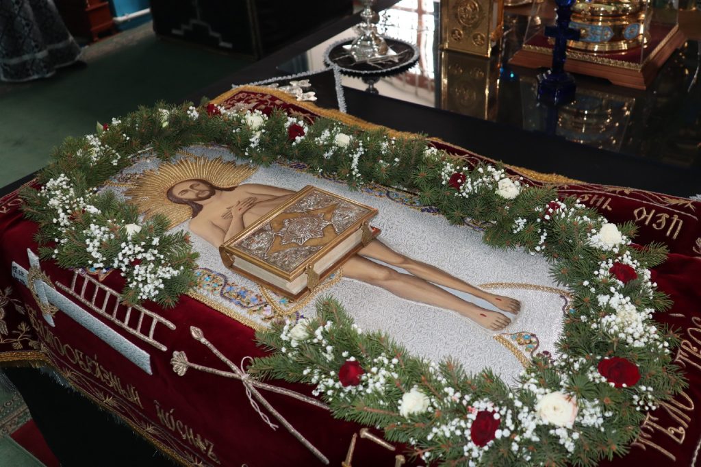 В конце богослужения во время пения тропарей епископ Митрофан, сотворив три земных поклона, с престола алтаря изнес на главе Святую Плащаницу в сопровождении клириков на середину храма, где ее положили на уготованную гробницу — возвышение, украшенное композициями живых цветов и умащенное благовониями в знак скорби о смерти Христа. На середину Плащаницы было положено Евангелие.