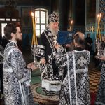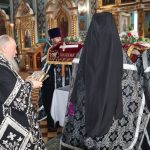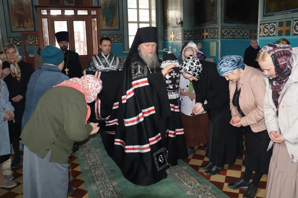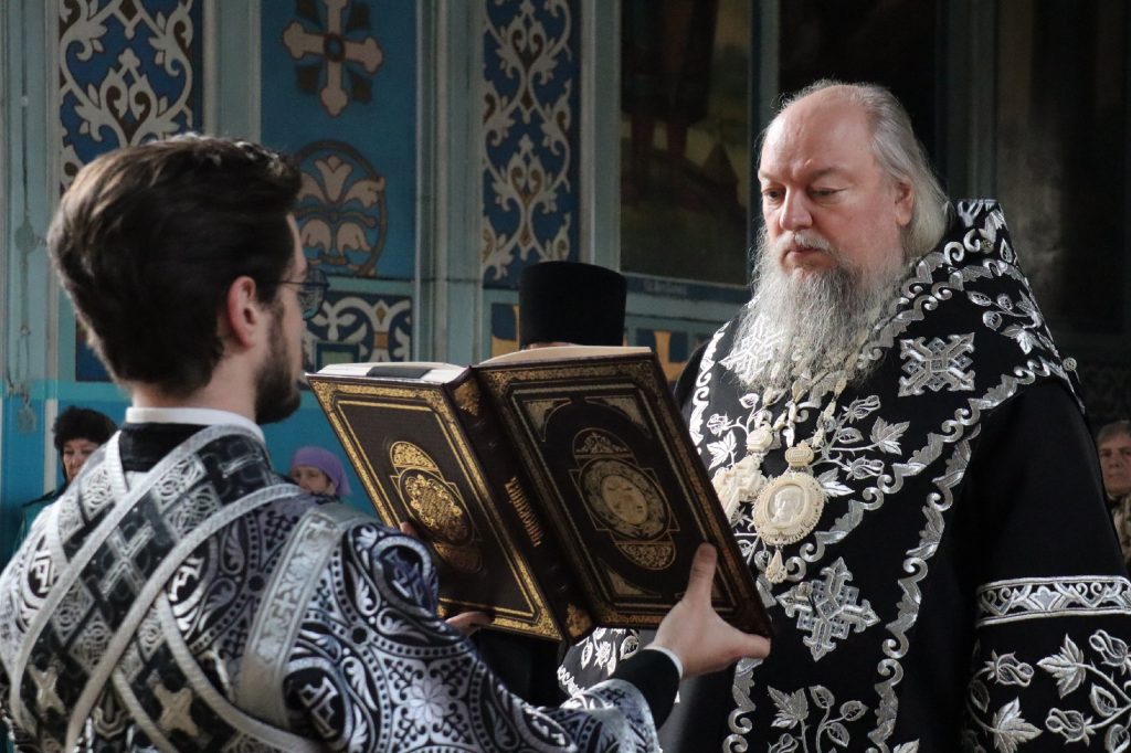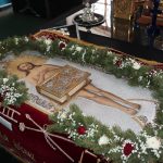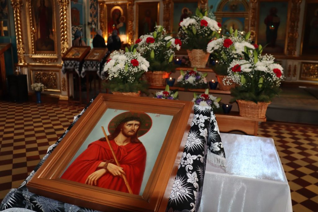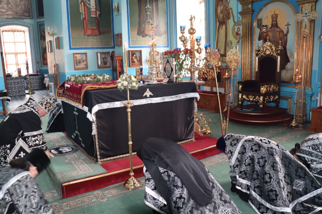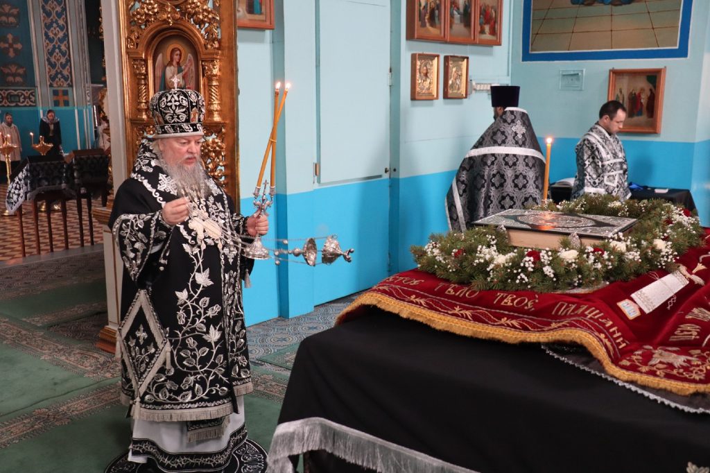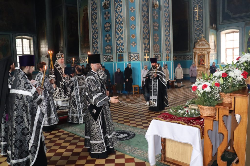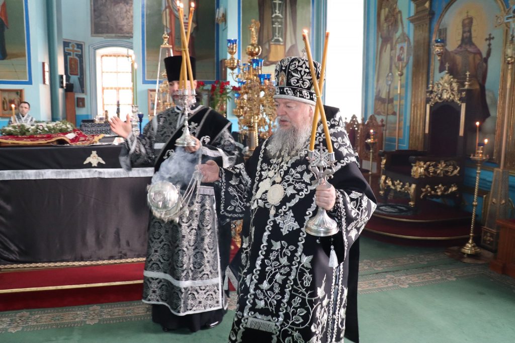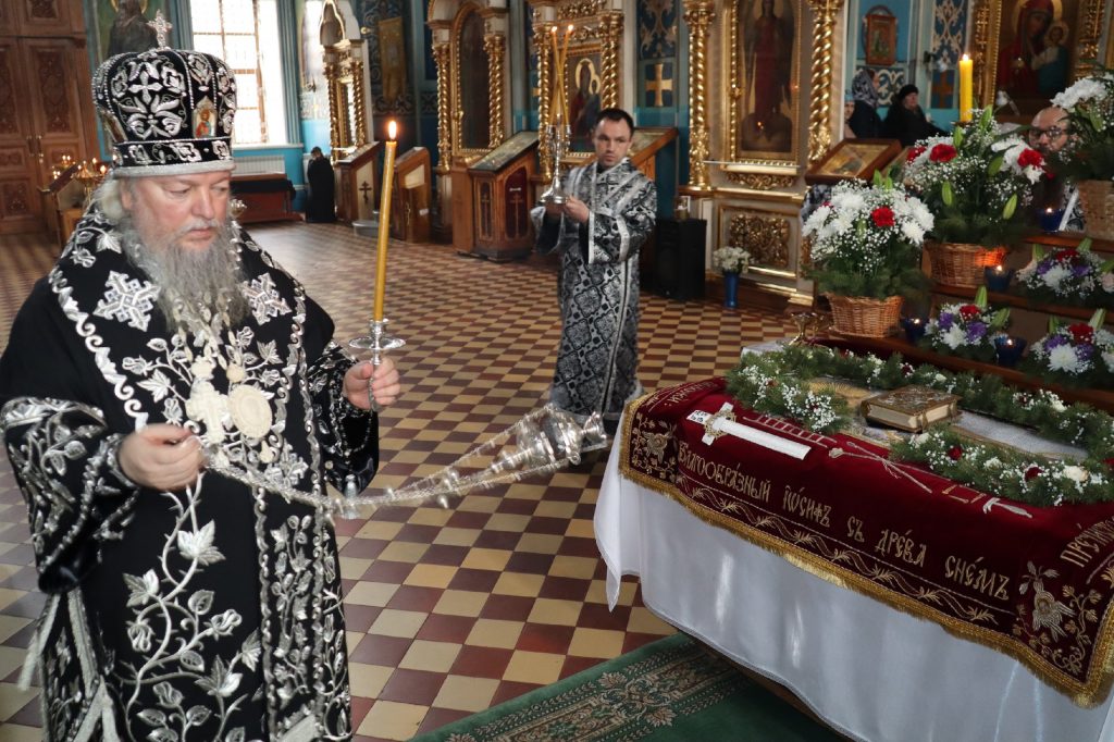 В конце богослужения во время пения тропарей епископ Митрофан, сотворив три земных поклона, с престола алтаря изнес на главе Святую Плащаницу в сопровождении клириков на середину храма, где ее положили на уготованную гробницу — возвышение, украшенное композициями живых цветов и умащенное благовониями в знак скорби о смерти Христа. На середину Плащаницы было положено Евангелие.