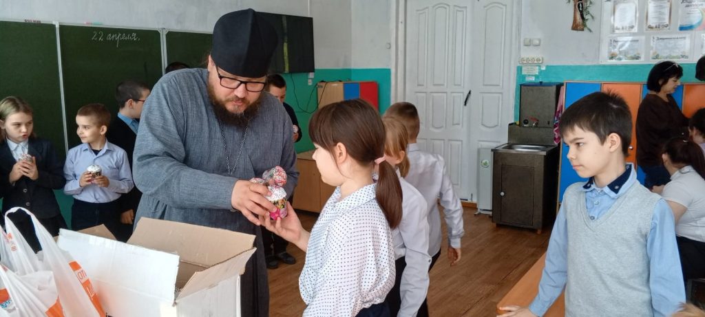 Священник поговорил с ребятами о значении этого Великого праздника, о том, как его правильно встречать, и о его истории. А потом раздал детям сладкие пасхальные подарки с пожеланиями здоровья, успехов, новых достижений и побед, отличных оценок и добрых дел.